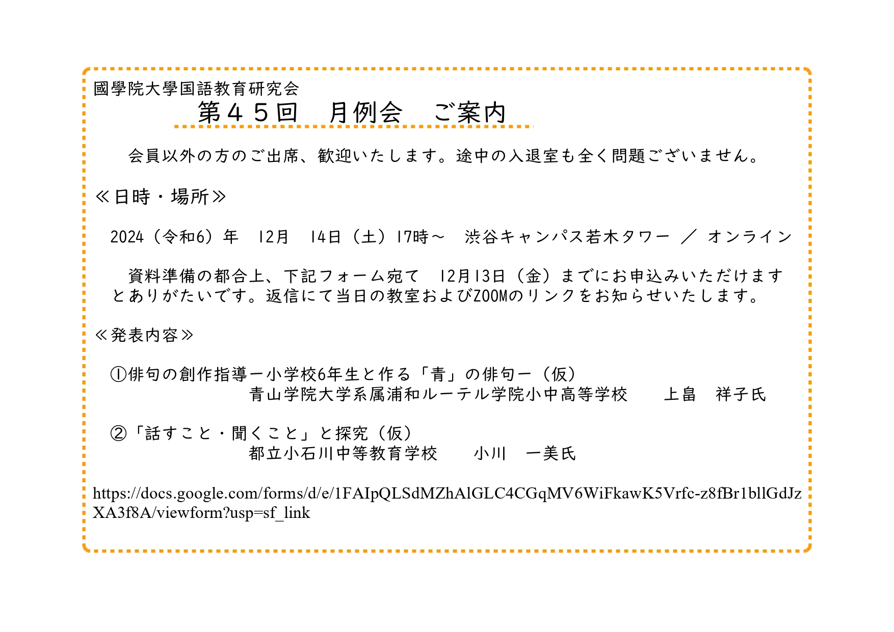 國學院大學国語教育研究会 第45回月例会を下記の通り開催いたします。