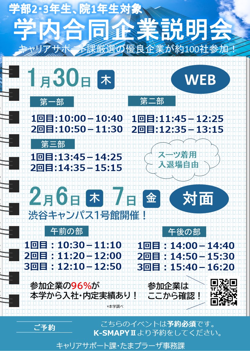 | 会場 | WEB実施:Zoom / 対面実施:渋谷キャンパス120周年記念1号館 |
