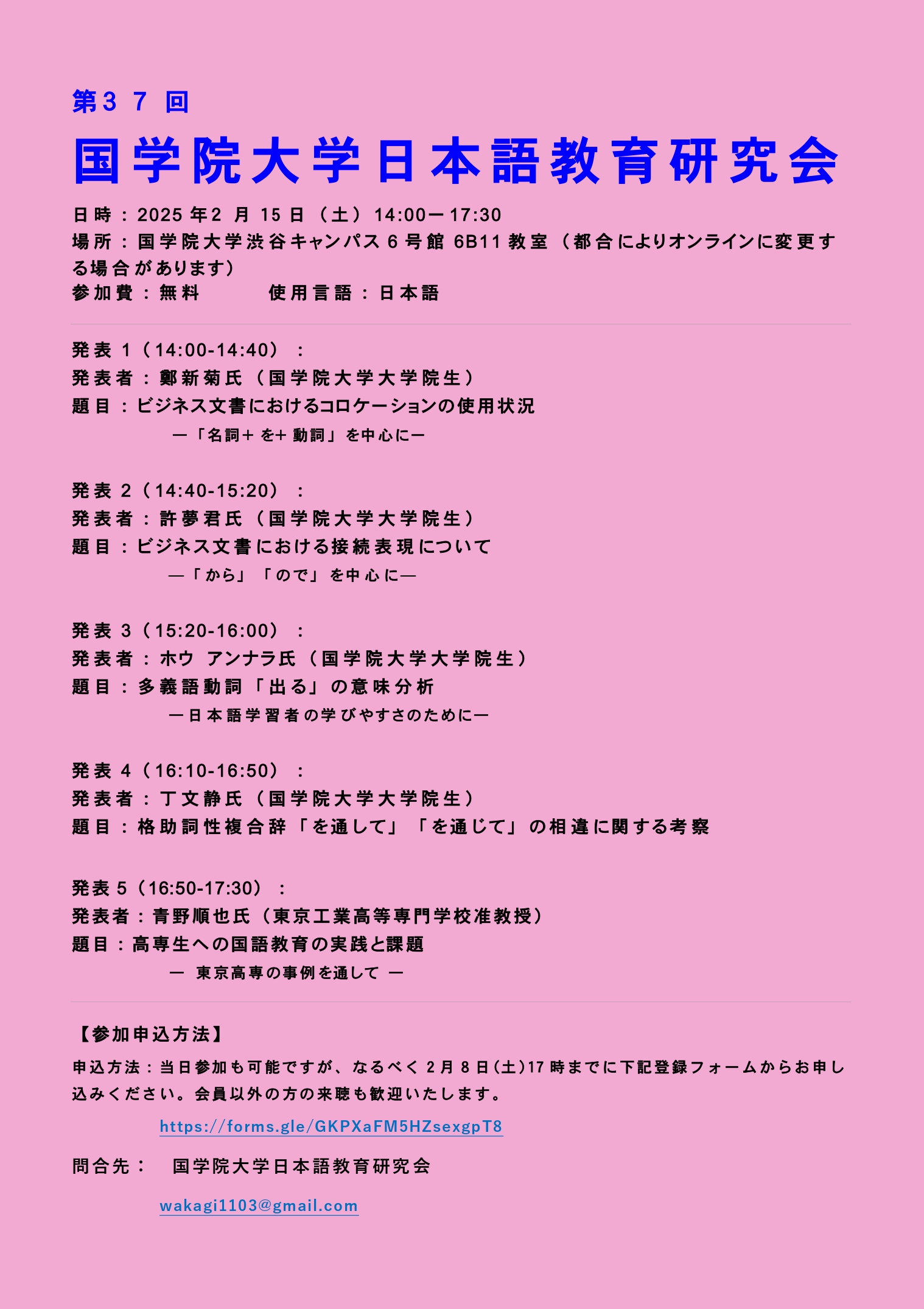 下記の通り、第37回国学院大学日本語教育研究会を開催いたします。