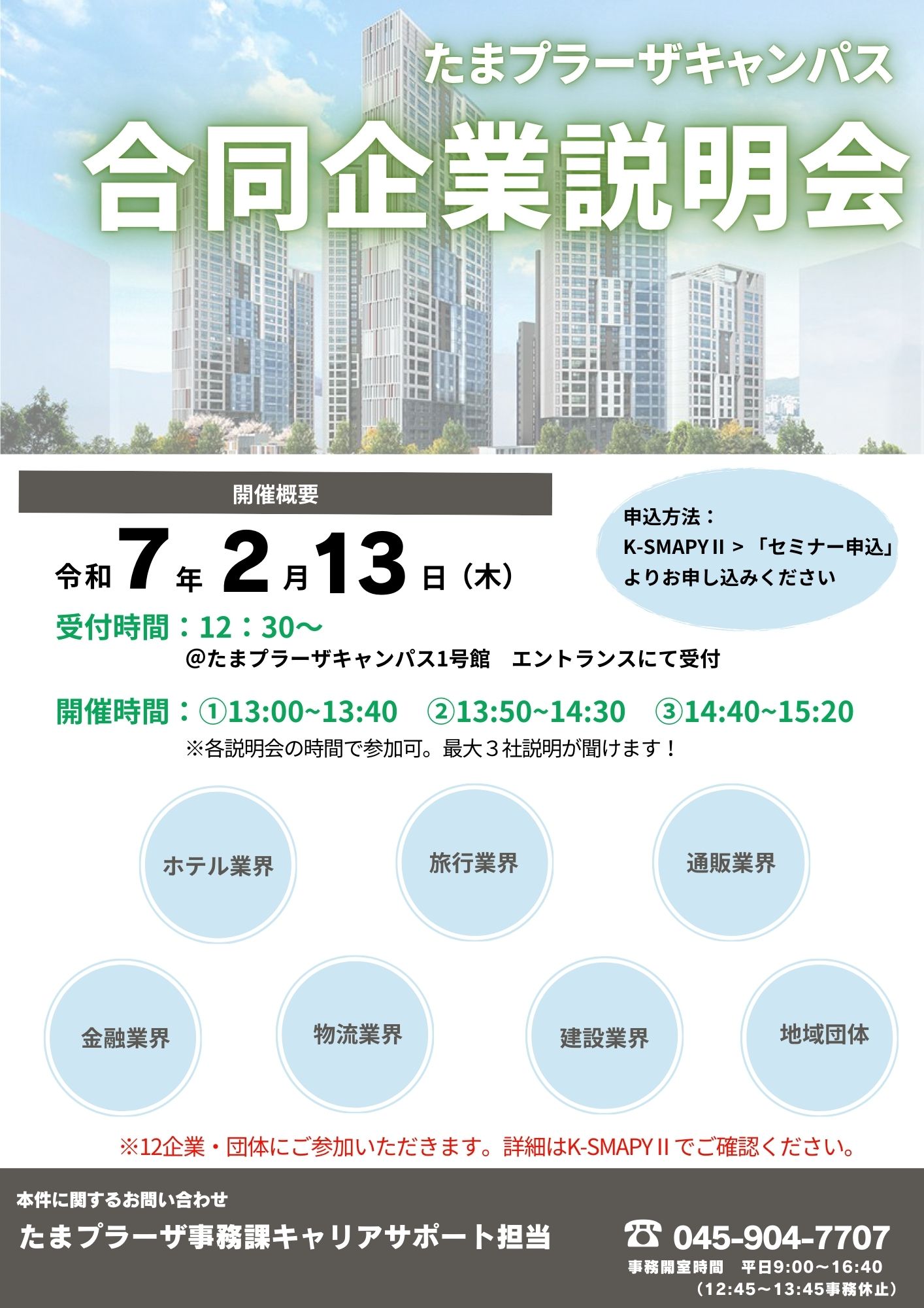 | 日時 | 2月13日(木) 12:30受付開始 ①13:00~13:40 ②13:50~14:30 ③14:40~15:20 ※各説明会の時間で参加可能。 |
