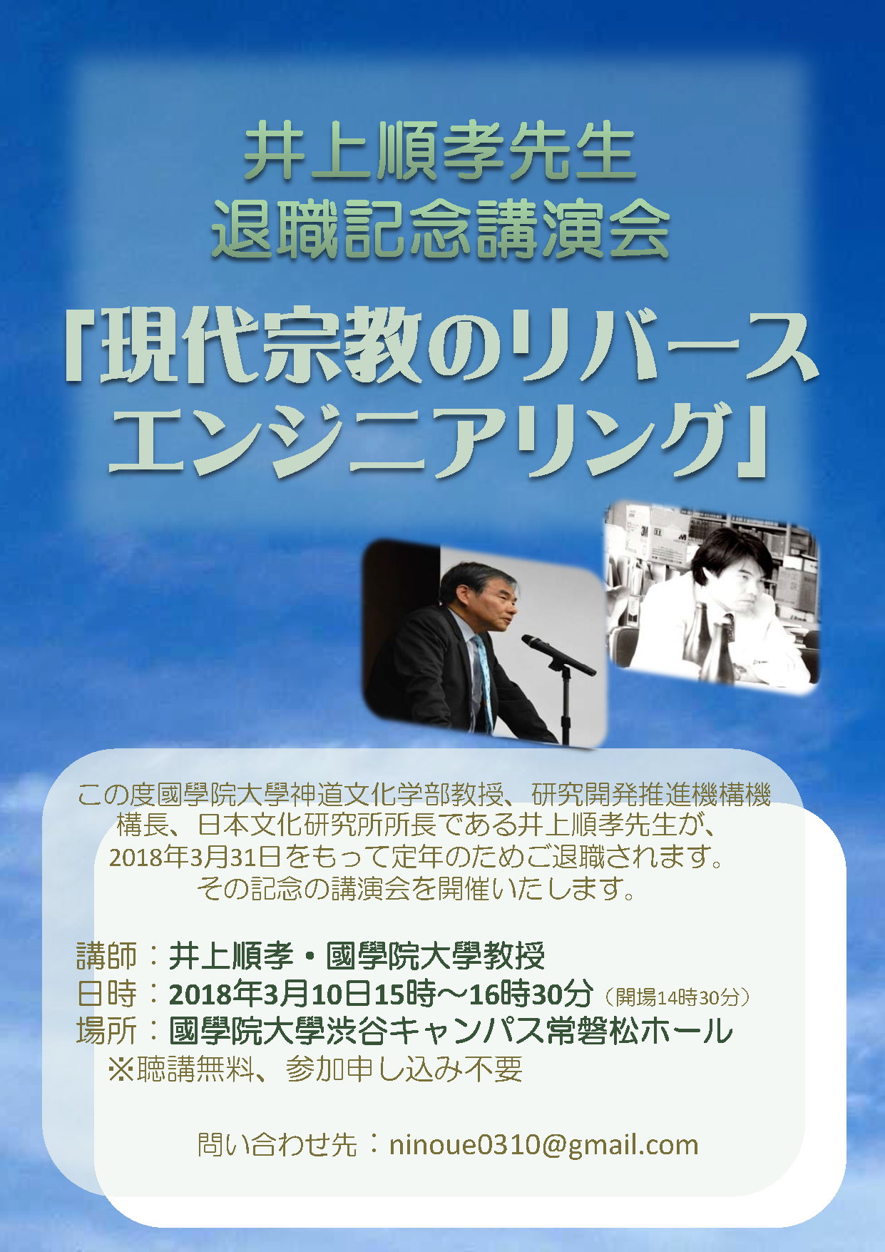 この度、2018年3月31日をもって、本学神道文化学部教授、研究開発推進機構機構長、日本文化研究所所長である井上順孝先生が定年のため本学を退職されることになりました。