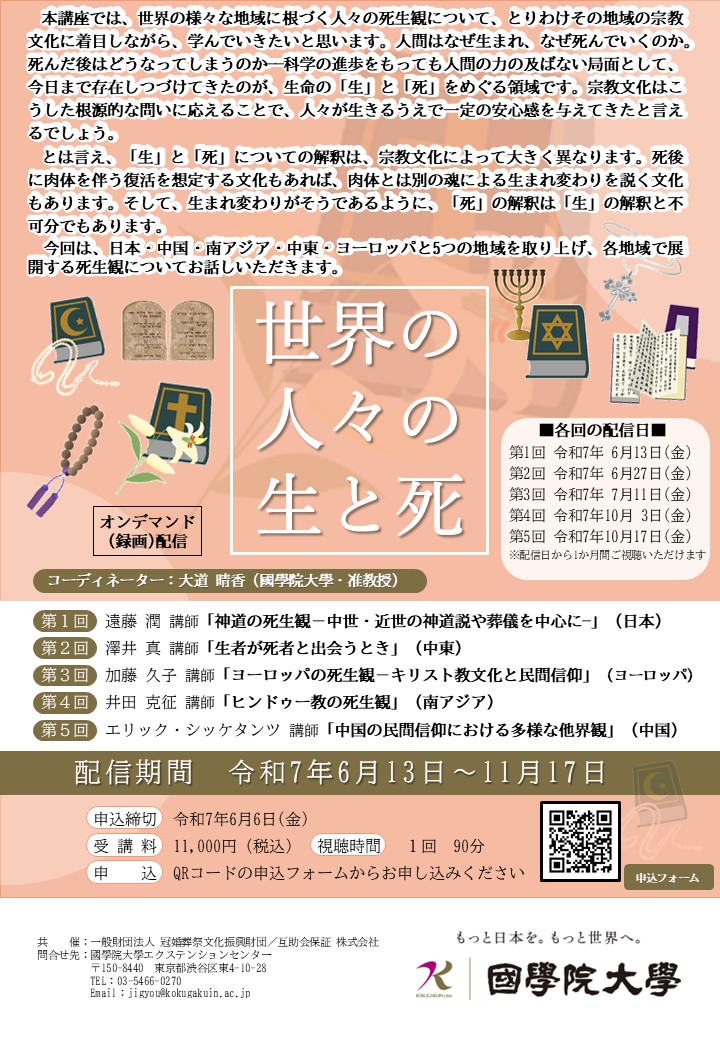 | 1 | 2025/06/13(金) | 「神道の死生観-中世・近世の神道説や葬儀を中心に—」(日本) | 遠藤潤(國學院大學・教授) |