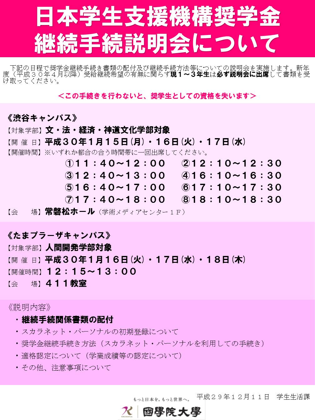 下記の日程で奨学金継続手続き書類の配付及び継続手続方法等についての説明会を実施します。新年度(平成30年4月以降)受給継続希望の有無に関らず現1~3年生は必ず説明会に出席して書類を受け取ってください。