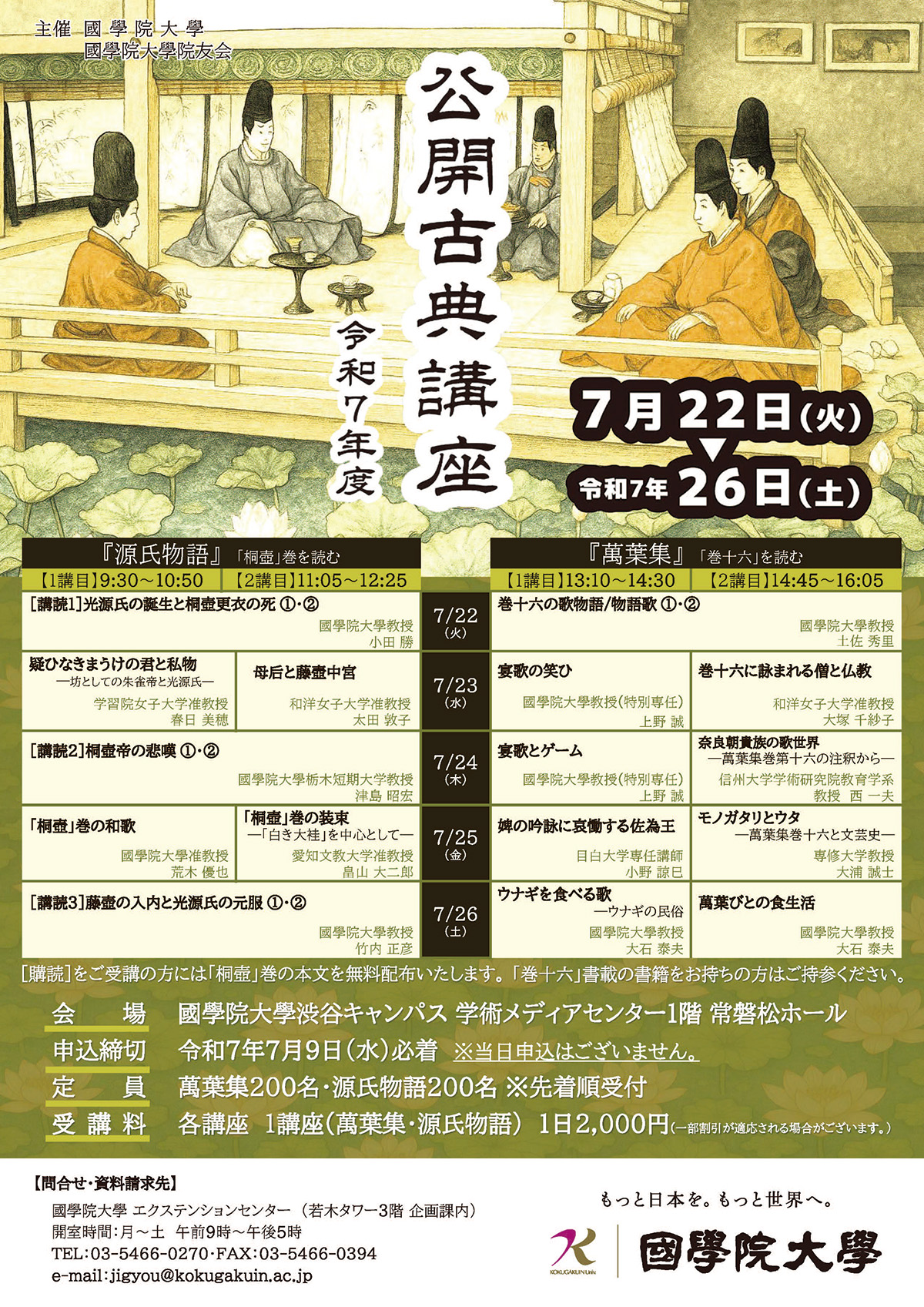 【7月9日締め切り】令和7年度 公開古典講座 全ての方向け Tweet 2025年6月9日更新 昭和初期にはじめて開講した「萬葉講座」の流れを受け継ぎ、 「古典文学の國學院」ならではの伝統に根ざした内容の夏季短期集中講座です。 ★お申込み等、詳細については>>>こちら<<<をご覧ください。