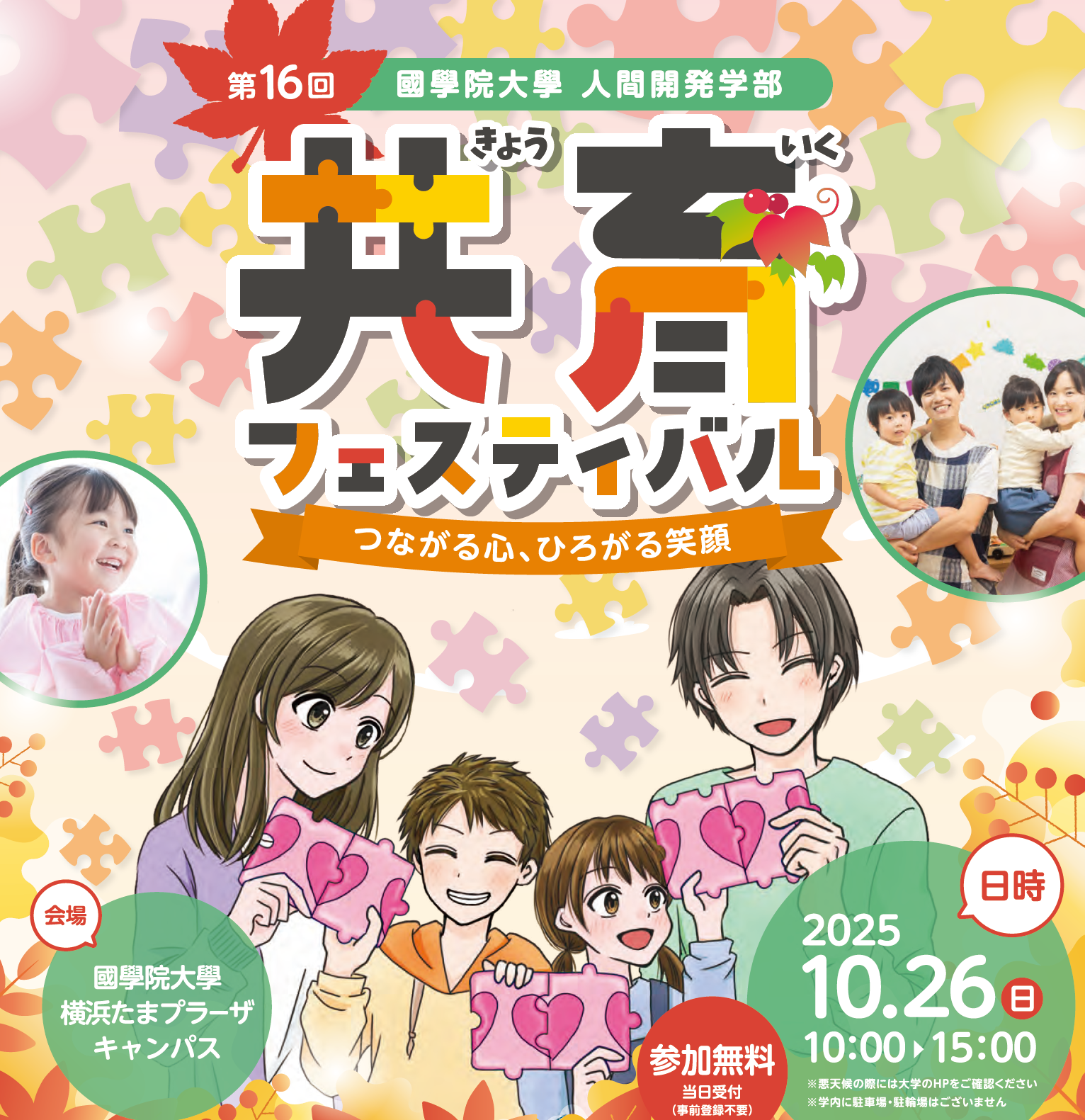 このテーマには、共育フェスティバルに関わるすべての人--遊びに来てくれることどもや保護者、学生、先生、地域の方々--の心がつながり、その輪が広がっていってほしいという想いを込めました。来場してくださる皆さま様にはもちろん、運営を担う学生を含め、会場にいるすべての人がつながり、笑顔になれる共育フェスティバルを目指します。