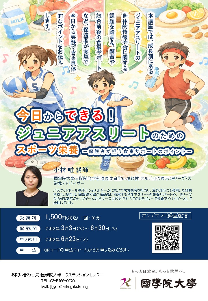 本講座では、成長期にあるジュニアアスリートの身体的特徴や食に関する課題を踏まえ、練習や試合前後の食事サポートなど、保護者が家庭で今日から実践できる具体的なポイントをお伝えします。