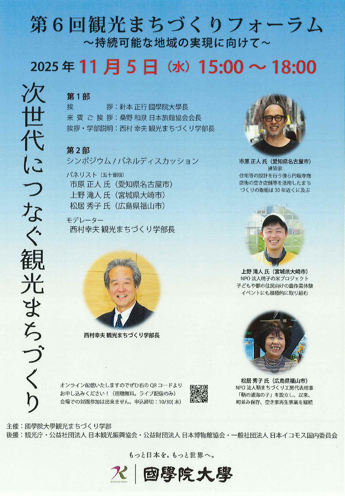 第6回「観光まちづくりフォーラム」~持続可能な地域の実現に向けて~ では、観光まちづくりに携わる方々をお招きし、民間や行政の協業による取り組みに焦点をあてて、本学部が考える観光まちづくりとは何か、持続可能な地域の実現に観光がどのように関わっていくのか、議論を深める場にしたいと存じます。