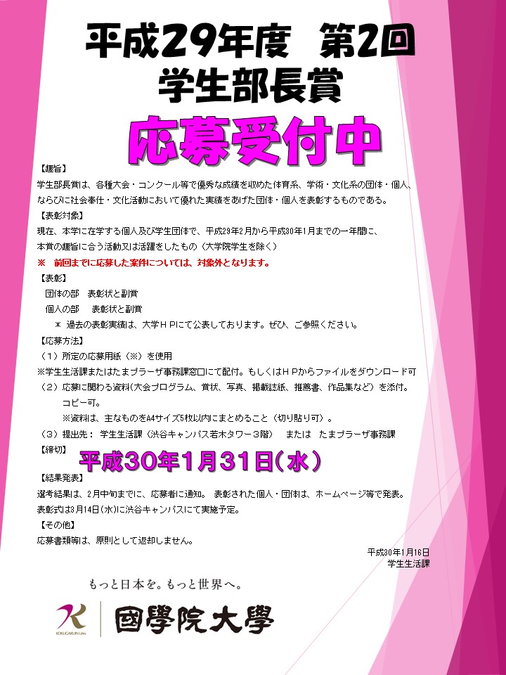 学生部では平成29年度第2回の「学生部長賞」を募集いたします。