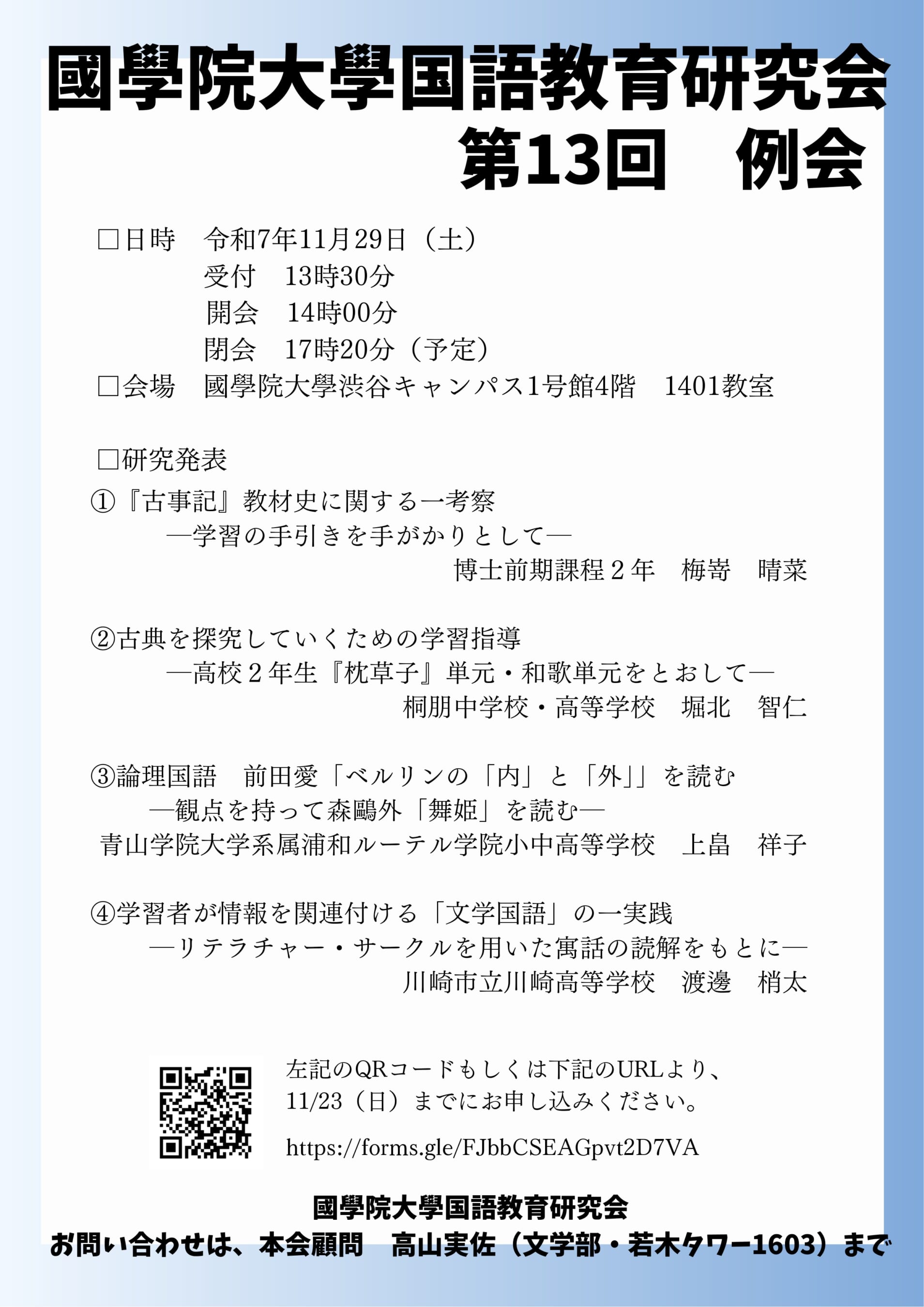 | お問い合わせ | 國學院大學国語教育研究会 本会顧問 高山実佐(文学部・若木タワー1603) |