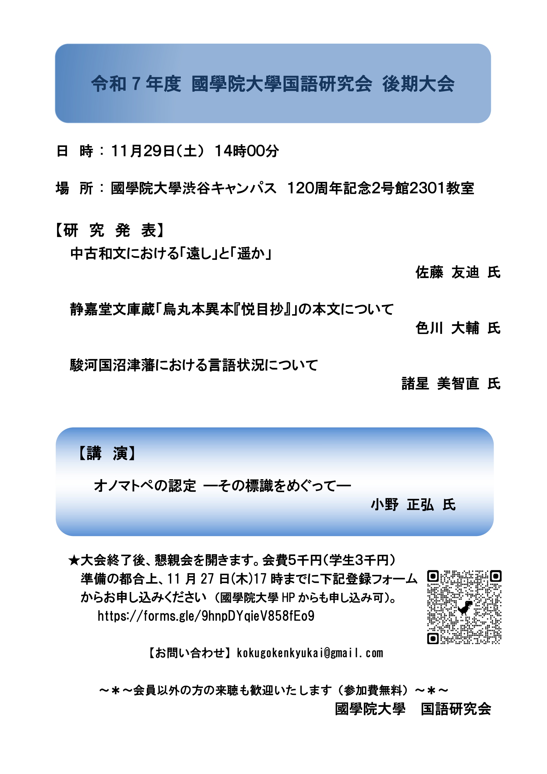 ★大会終了後、懇親会を開きます。会費5千円(学生3千円) お問い合わせ kokugokenkyukai@gmail.com |