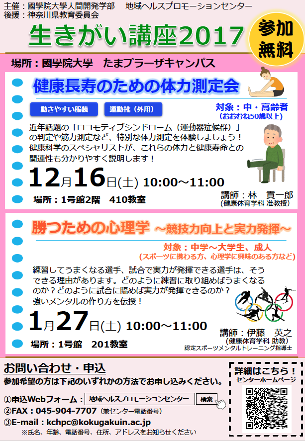 地域ヘルスプロモーションセンターでは、月1回のペースで、國學院大學人間開発学部の教員がオムニバス形式で登場する生きがい講座を開講中です!