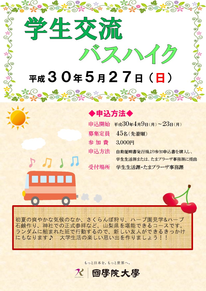 学生生活課では、平成30年5月27日(日)に学生部企画「学生交流バスハイク」を実施します。