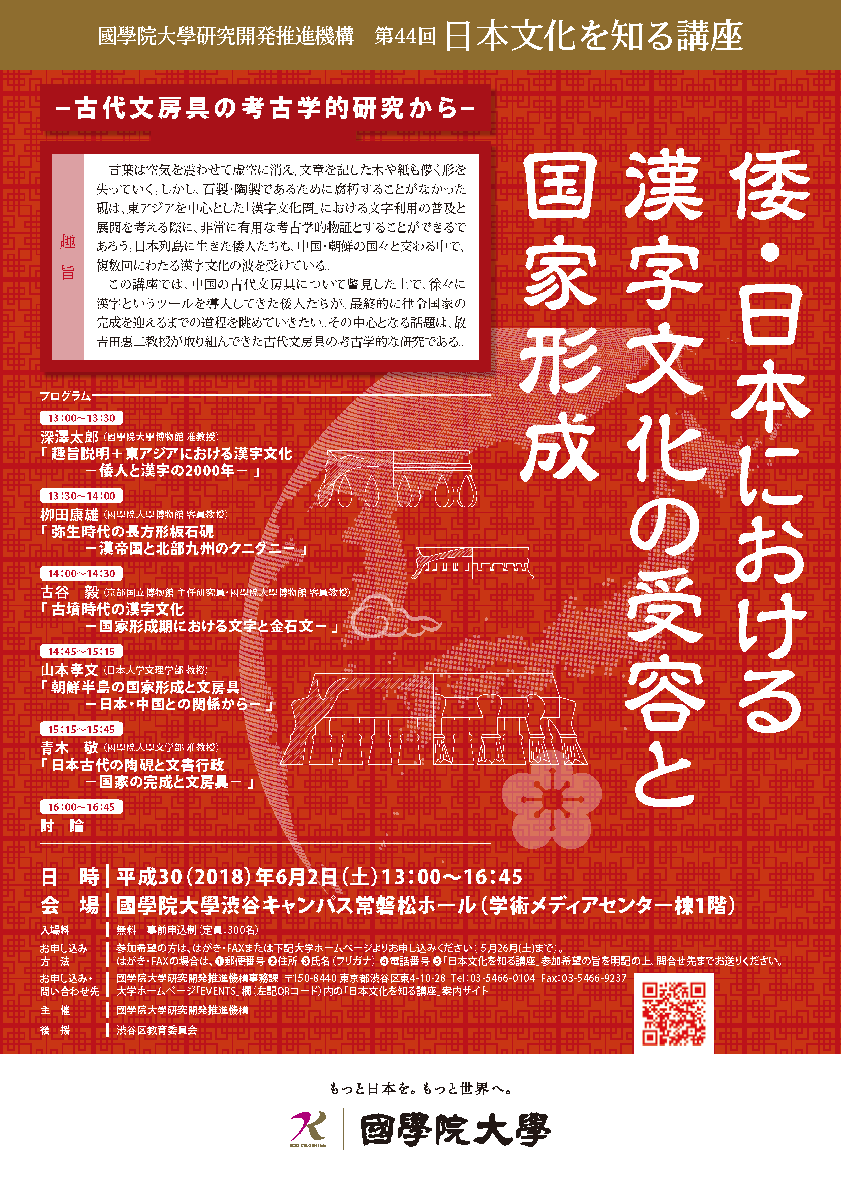 13:00~13:30 深澤太郎(國學院大學博物館 准教授)「趣旨説明+東アジアにおける漢字文化-倭人と漢字の2000年-」 13:30~14:00 栁田康雄(國學院大學博物館 客員教授)「弥生時代の長方形板石硯―漢帝国と北部九州のクニグニ―」 14:00~14:30 古谷 毅(京都国立博物館 主任研究員・國學院大學博物館 客員教授)「古墳時代の漢字文化―国家形成期における文字と金石文―」 14:45~15:15 山本孝文(日本大学文理学部 教授)「朝鮮半島の国家形成と文房具―日本・中国との関係から―」 15:15~15:45 青木 敬(國學院大學文学部 准教授)「日本古代の陶硯と文書行政―国家の完成と文房具―」 16:00~16:45 討論 |