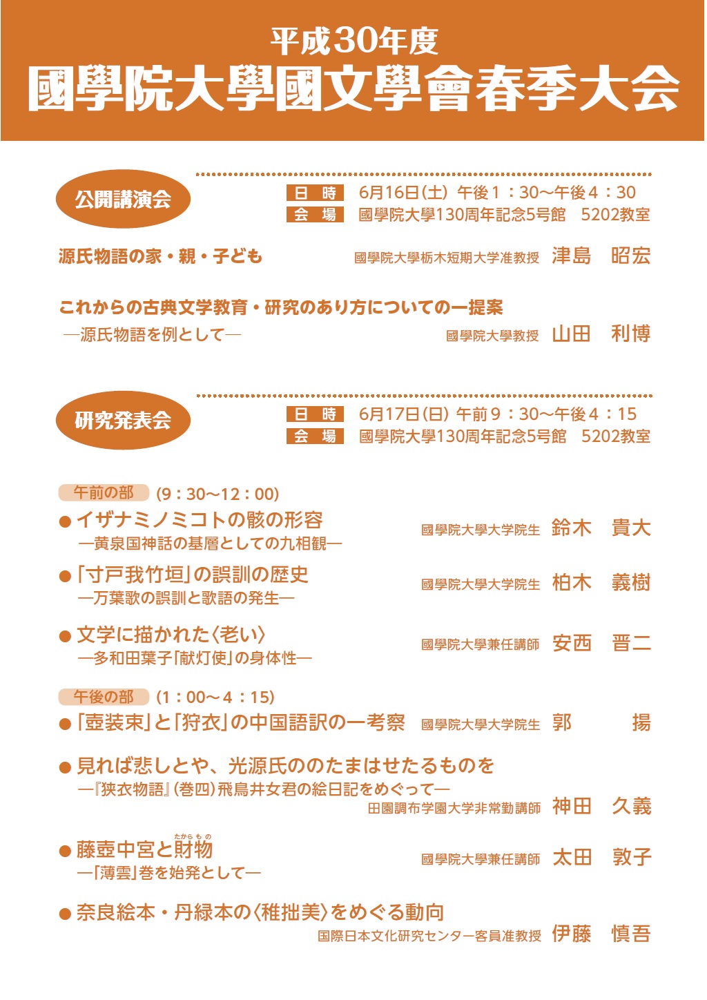 下記の通り、平成30年度國學院大學國文學會春季大会を開催いたします。