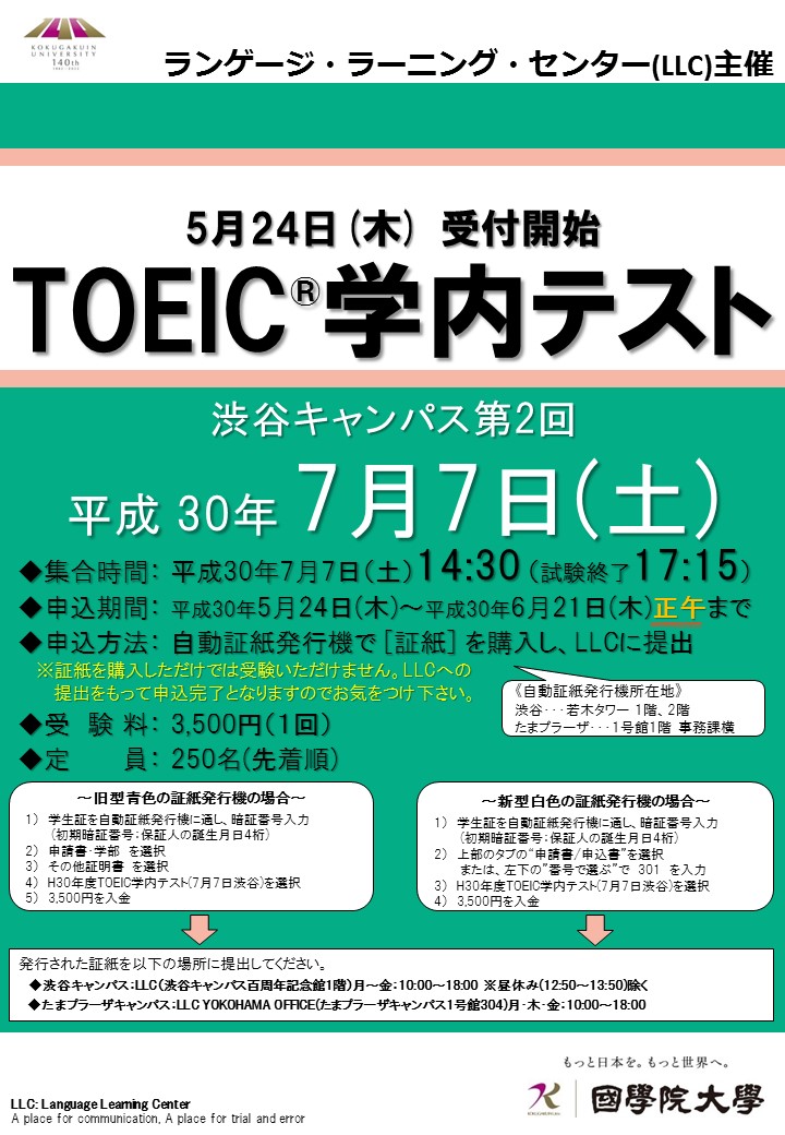 ランゲージ・ラーニング・センター(LLC)では、平成30年7月7日に第2回 TOEIC学内テスト(TOEIC IP)を実施いたします