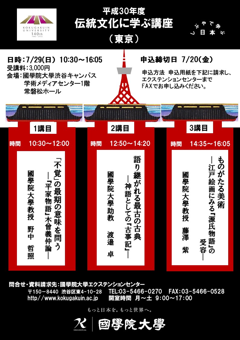 平成30年度 伝統文化に学ぶ講座(東京) 全ての方向け Tweet 2018年6月6日更新 日時 平成30年7月29日(日)10:30~16:05 会場 國學院大學渋谷キャンパス 常磐松ホール 定員 300名 問い合わせ 國學院大學エクステンションセンター TEL:03-5466-0270 昭和25年に文部省の後援のもと始まった講座で、 毎年夏のシーズンに伝統文化(古典文学・民俗学)をテーマにした1日集中講座です。 ★お申込み等、詳細についてはこちらへ