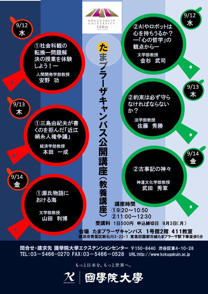 平成30年度たまプラーザキャンパス公開講座(教養講座) 全ての方向け Tweet 2018年6月6日更新 日時 平成30年9月12日(水)~14日(金)9:20~12:30 会場 國學院大學たまプラーザキャンパス 1号館2階 411教室 問い合わせ 國學院大學エクステンションセンター TEL:03-5466-0270 たまプラーザキャンパスを会場に毎年開催している講座で、 文学、史学、宗教、教育、法律、経済等々、 専門の分野からその時々のタイムリーなテーマを題材に企画しています。 ★お申込み等、詳細についてはこちらへ
