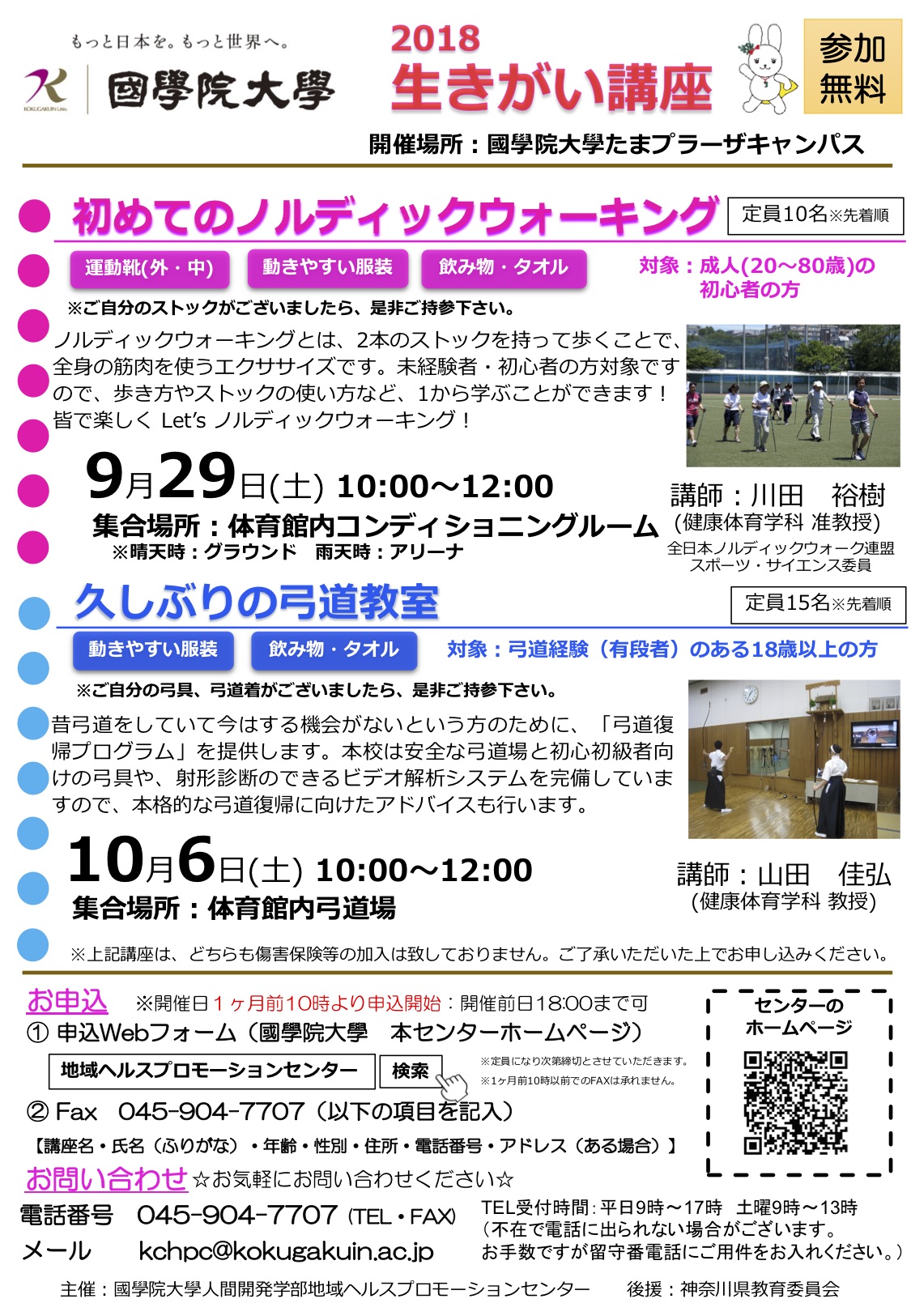※本講座は終了致しました。ありがとうございました! お申込はこちらから! ※開催日1ヶ月前10時より申込開始 初めてのノルディックウォーキングは8月29日午前10時よりお申込を開始致します。 生きがい講座「初めてのノルディックウォーキング」申込フォーム ※申込が完了すると、自動返信システムにより確認メールが届きます。 (参加者様のメール設定により届かない場合がございますが、登録はされておりますのでご安心ください) 講座の約3日前に、担当者から再度確認メールをお送り致します。