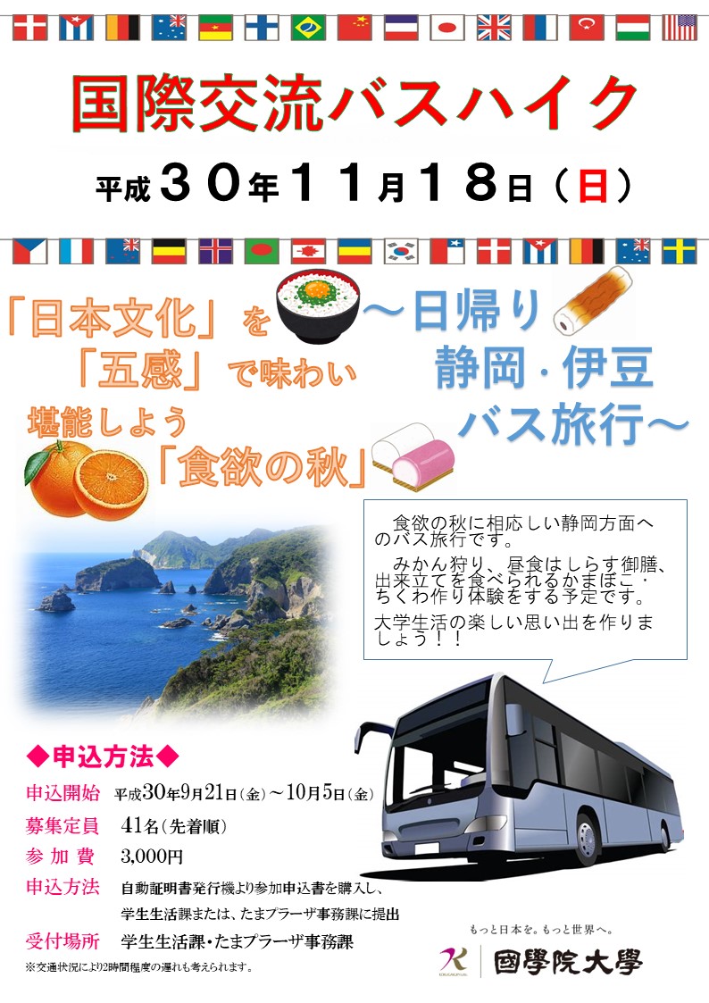 学生生活課では、平成30年11月18日(日)に学生部企画「国際交流バスハイク」を実施します。