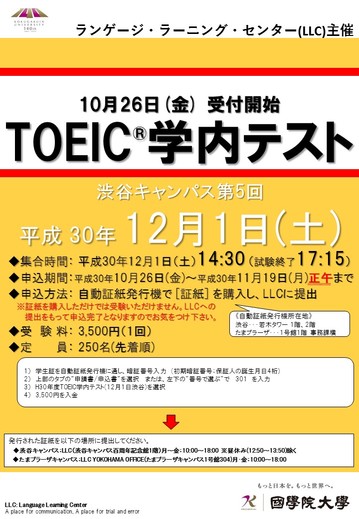 ランゲージ・ラーニング・センター(LLC)では、平成30年12月1日に第5回 TOEIC学内テスト(TOEIC IP)を実施いたします。