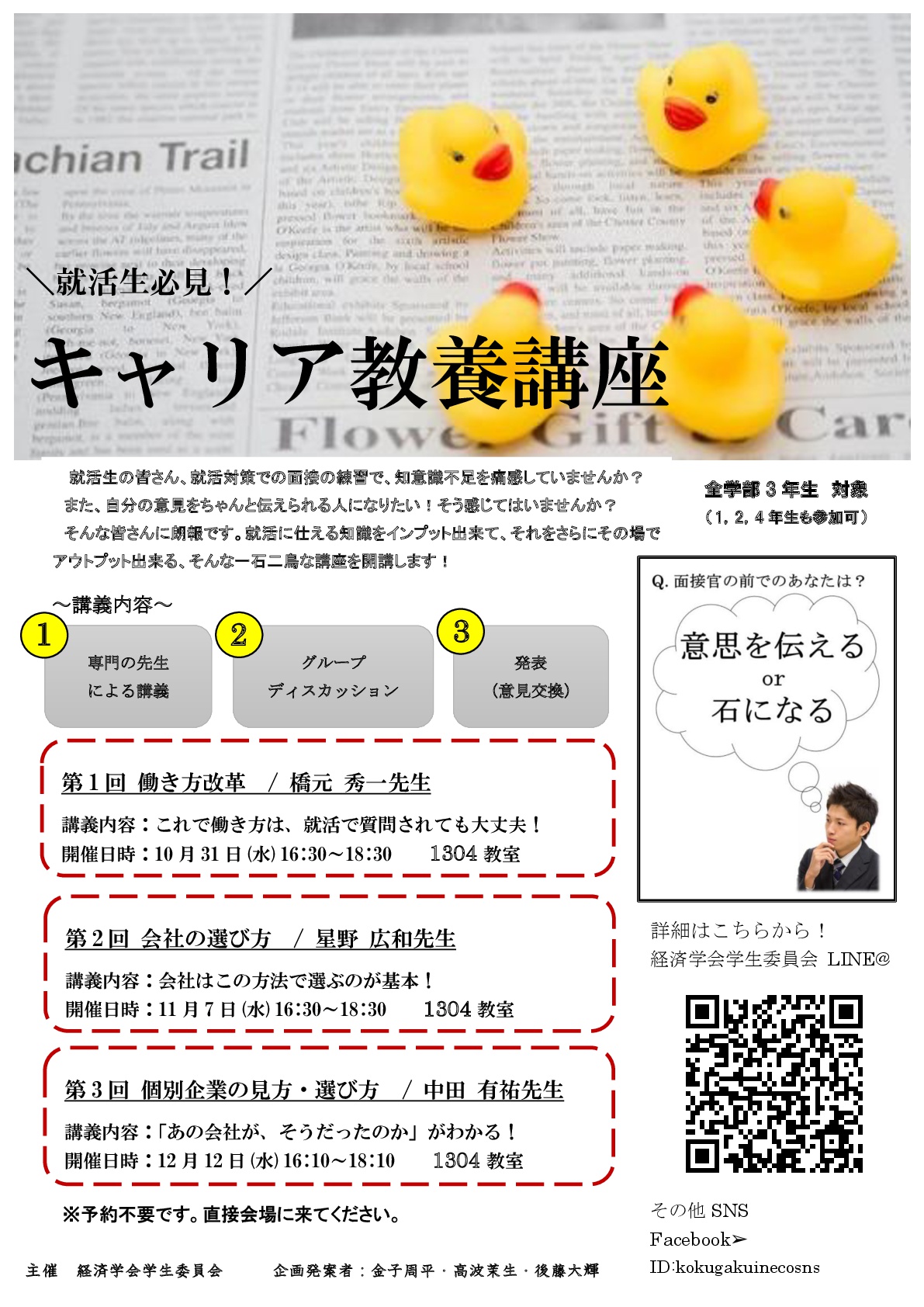 経済学部・経済学会学生委員会は、学生と教員が学びを通して結びつく機会を提供するために、今年度から「キャリア・教養講座」を実施します。