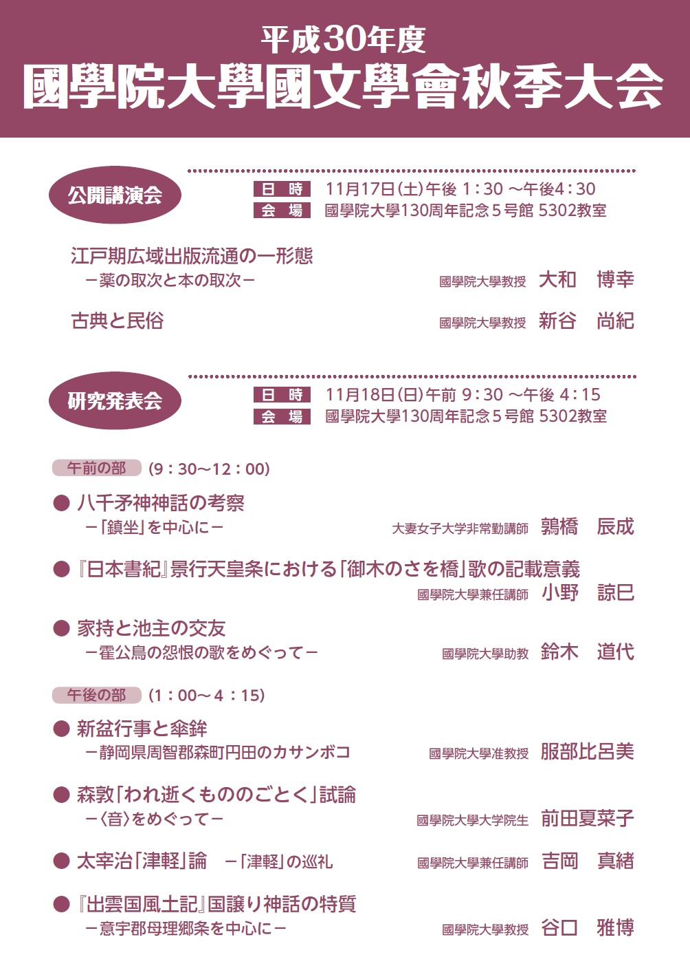 | 会 場 | 國學院大學130周年記念5号館3階 5302教室 |