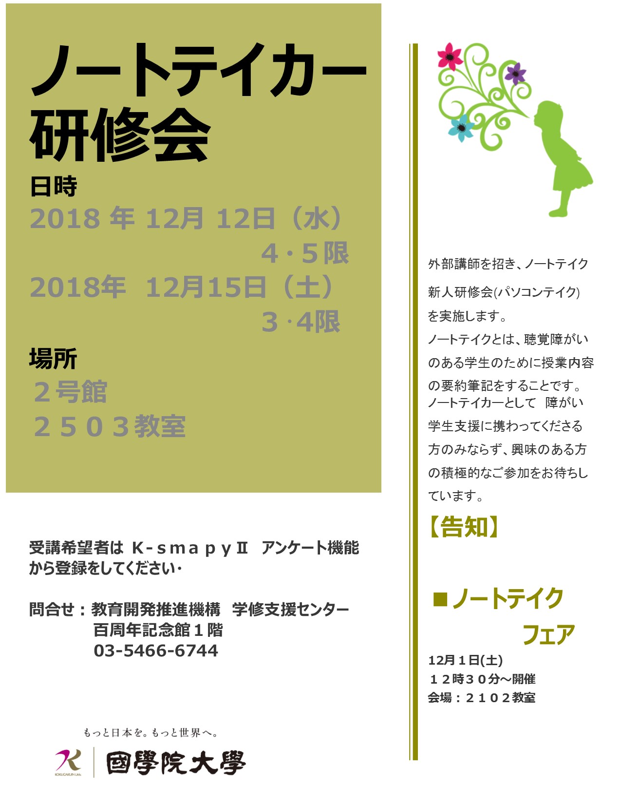学修支援センターでは、外部講師を招き、ノートテイク新人研修会(パソコンテイク)を実施します。 ノートテイクとは、聴覚障がいのある学生のために授業内容の要約筆記をすることです。 ノートテイカーとして障がい学生支援に携わってくださる方のみならず、興味のある方の積極的なご参加をお待ちしています。