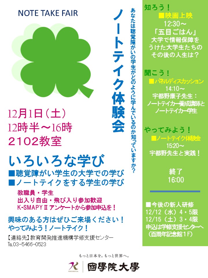 12月1日(土)12時30分~16時(於:2102教室)ノートテイクフェアを実施します。