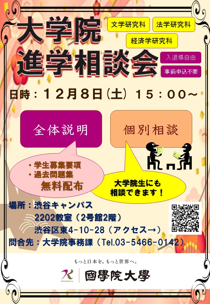 全体説明:渋谷キャンパス2202教室(2号館2階) 個別相談:若木タワー5階(大学院演習室) |