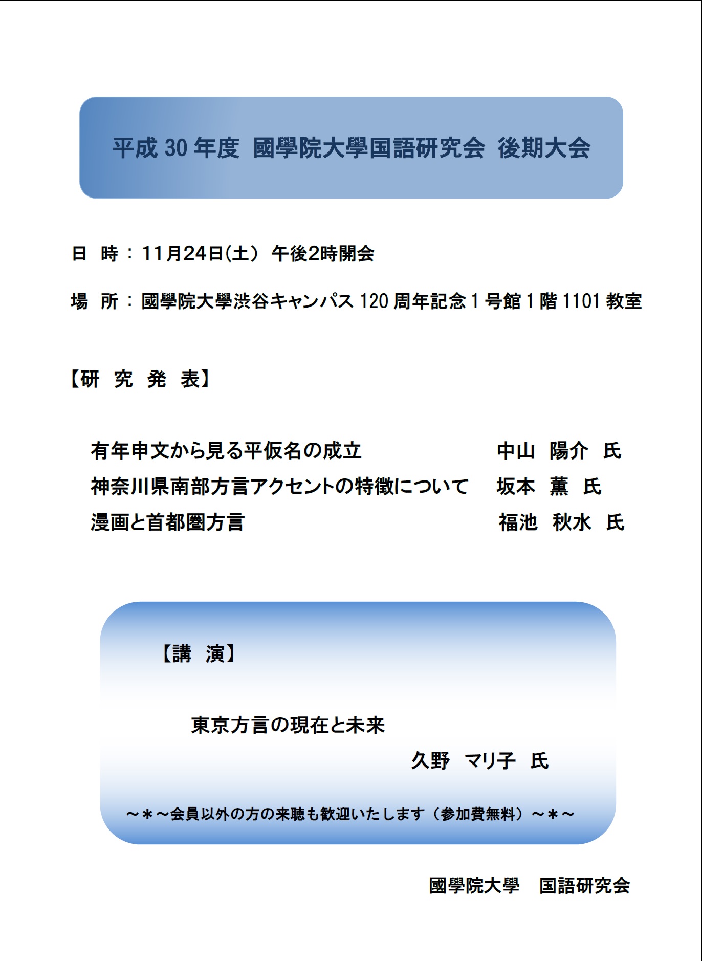 下記の通り、平成30年度國學院大學国語研究会後期大会を開催いたします。
