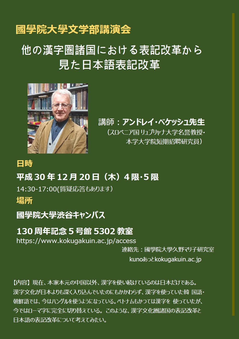 | 講師 | アンドレイ・ベケッシュ先生 (スロベニア国 リュブリャナ大学名誉教授・本学大学院短期招聘研究員) |