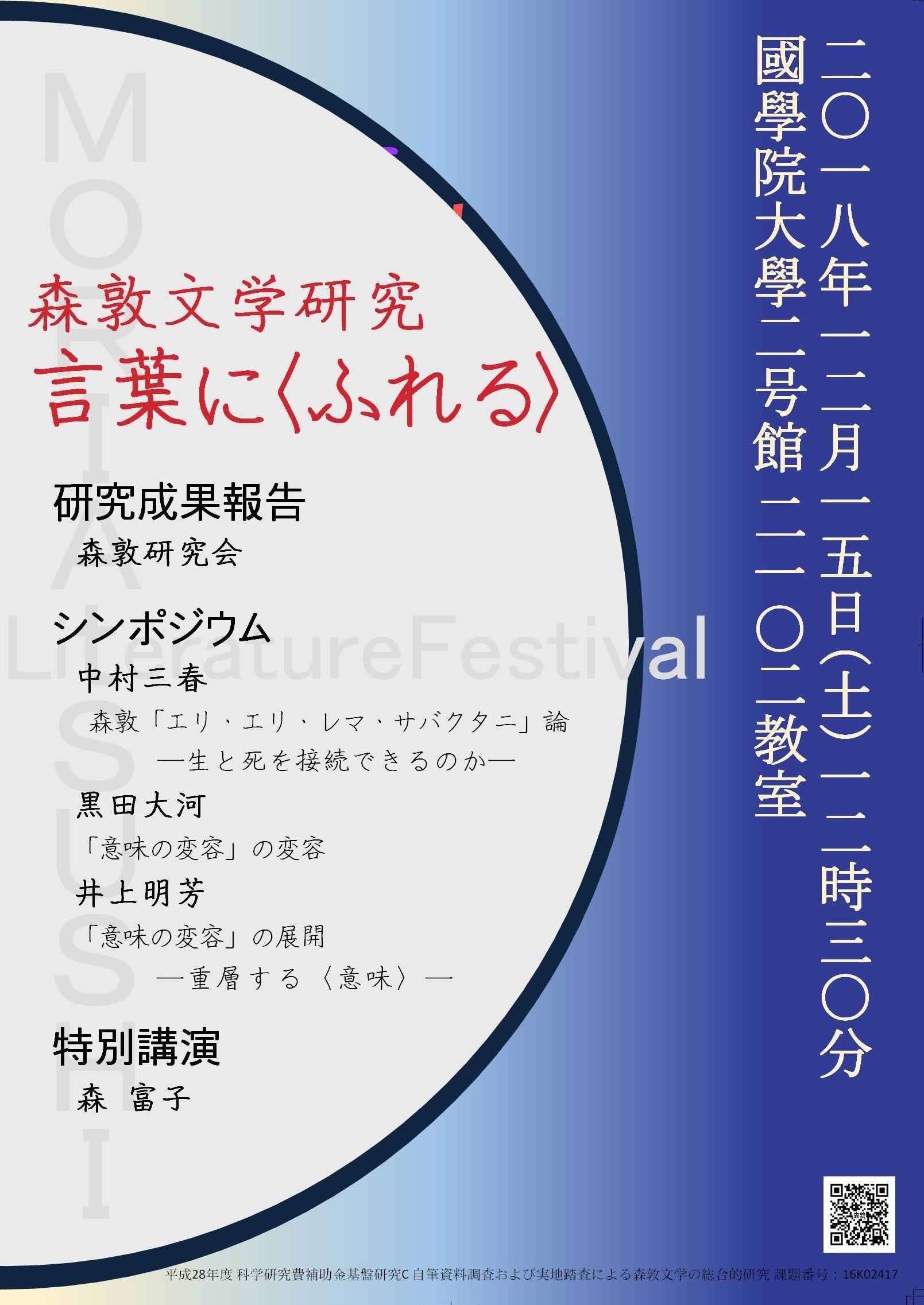 | 主 催 | 日本学術振興会平成28年度科学研究費助成事業(基盤研究(C)) 「自筆資料および実地踏査による森敦文学の総合的研究」 研究代表者 井上明芳 研究課題番号16K02417 |