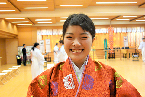 式典の装束は、各地の院友神職の方々から寄贈されたものです。新成人の装束には、全国からの「祝福のまごころ」が篭っているのです。