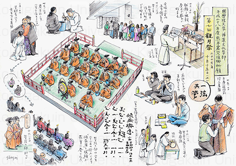 神道文化学部4年の二宮さんが、観月祭の細やかな絵図を製作中とのこと、完成が楽しみです。