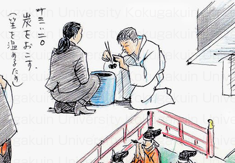 火鉢で炭をおこしています。