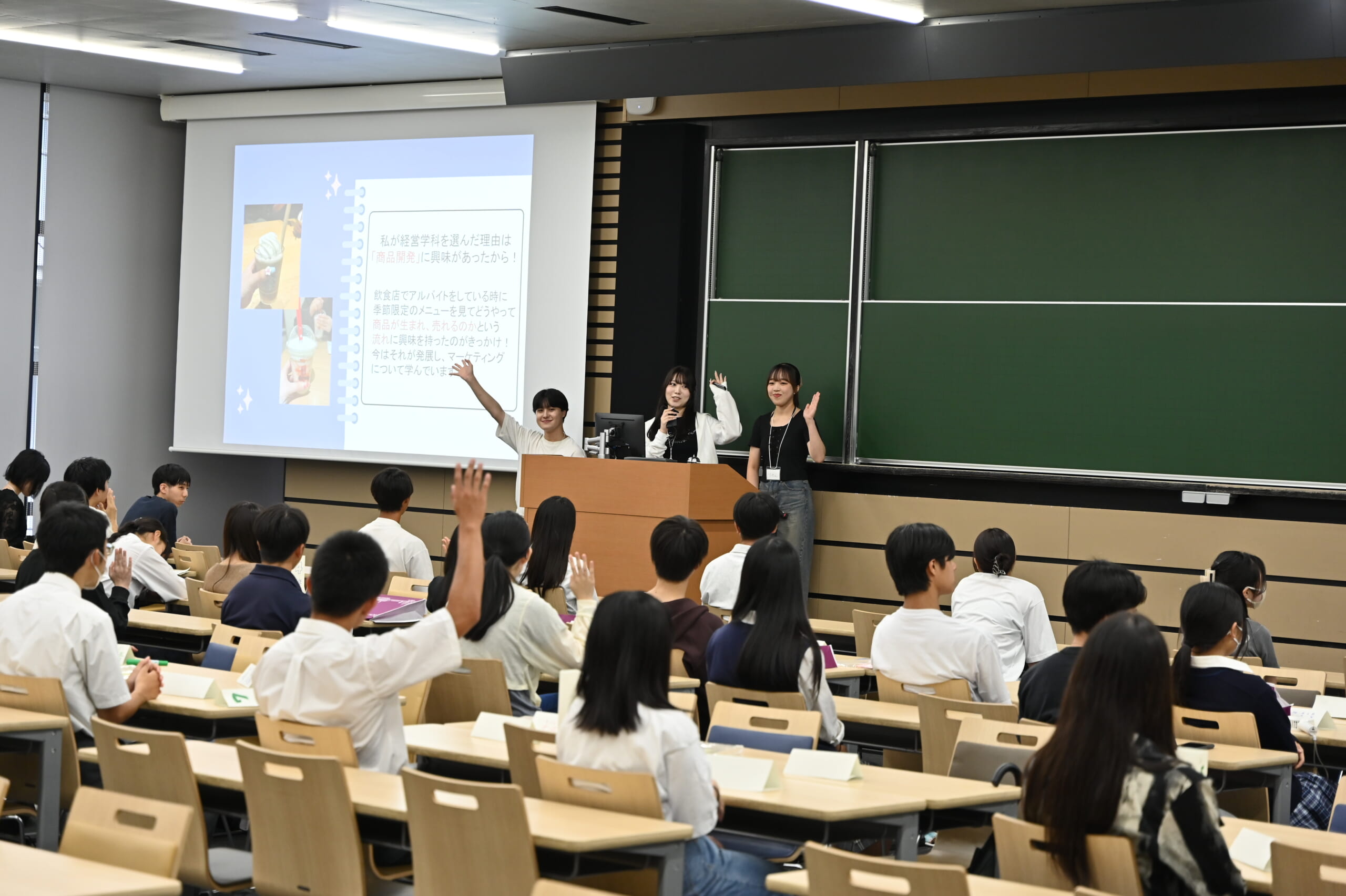 令和7(2025)年9月20日に、経済学部生を体験する「E-Tour」の第1回目が渋谷キャンパスで開催されました。E-Tourは高校生を対象に、模擬授業やキャンパスツアー、学生とのフリートークなどを通して経済学部生の一日を疑似体験できる催しで、経済学会学生委員会の学生たちが毎年企画・運営を担当しています。