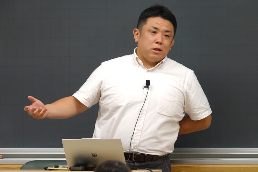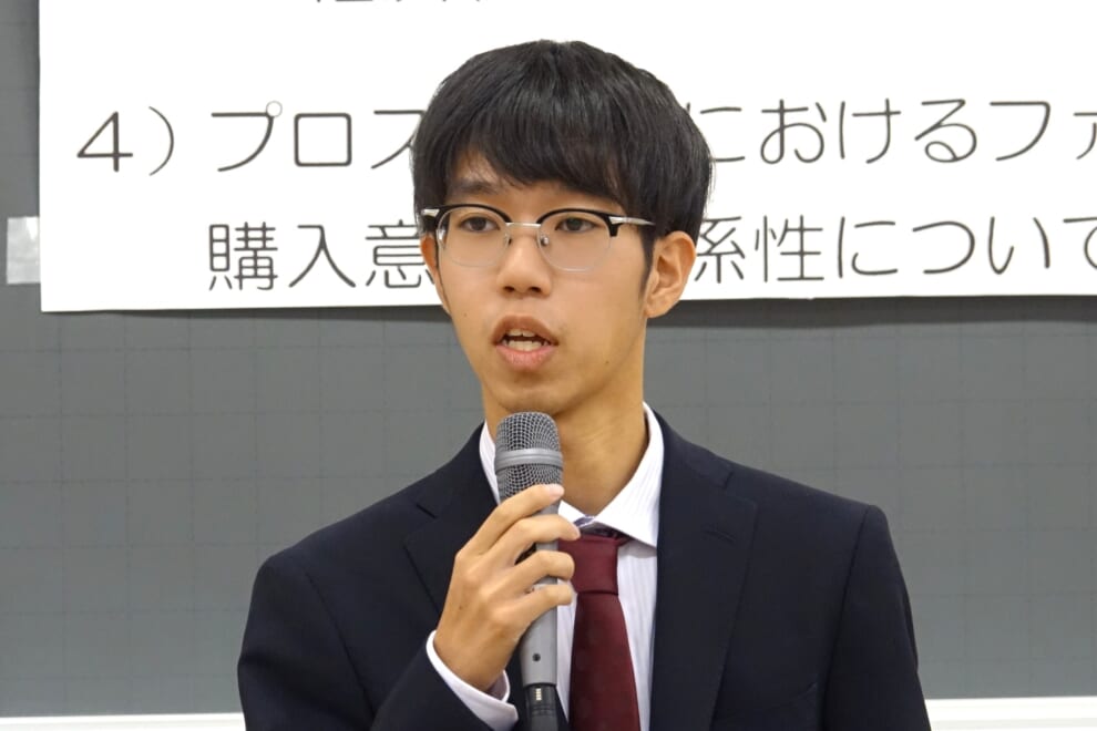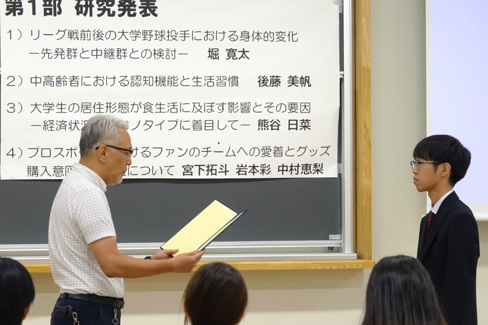 栄えある受賞者は、「リーグ戦前後の大学野球投手における身体的変化 -先発群と中継群との検討-」を発表した、堀寛太氏(健康体育学科)です。表彰ののち喜びの胸の内を語りました。おめでとうございます!