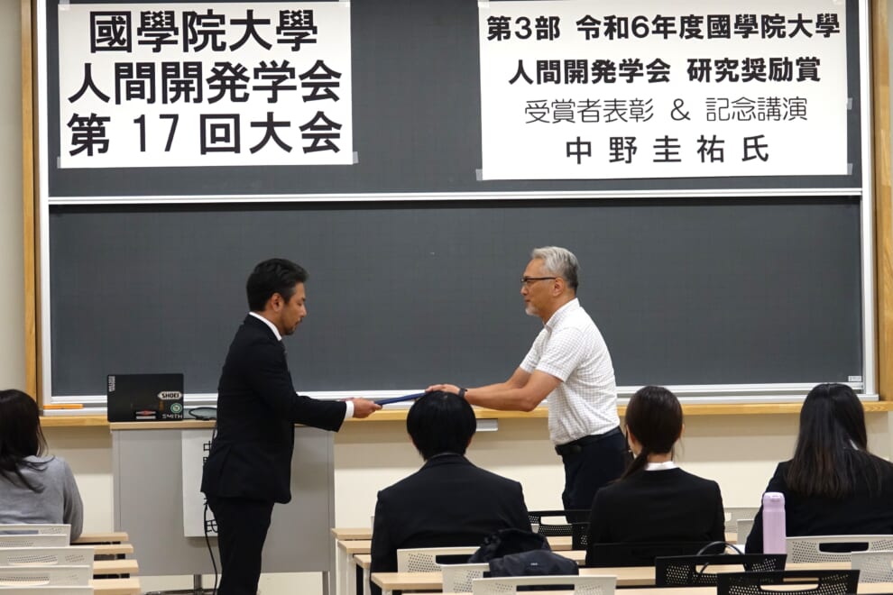 第3部は令和6年度國學院大學人間開発学会研究奨励賞表彰・受賞者記念講演です。この賞は、学部紀要である『國學院大學人間開発学研究』の前年度掲載論文において、もっとも内容が優れ、今後の研究の進展が期待される論文の著者に与えられるものです。受賞者は、中野圭祐氏(子ども支援学科助教)。受賞論文は「手遊び歌実演方法による子どもの夢中度の違い : 熟達保育者と非熟達保育者の比較」です。