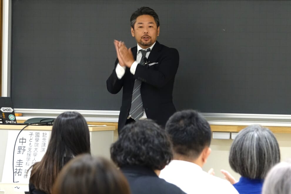 表彰式に続いて、中野氏による記念講演が、手遊び歌の実演を交えて行われました。