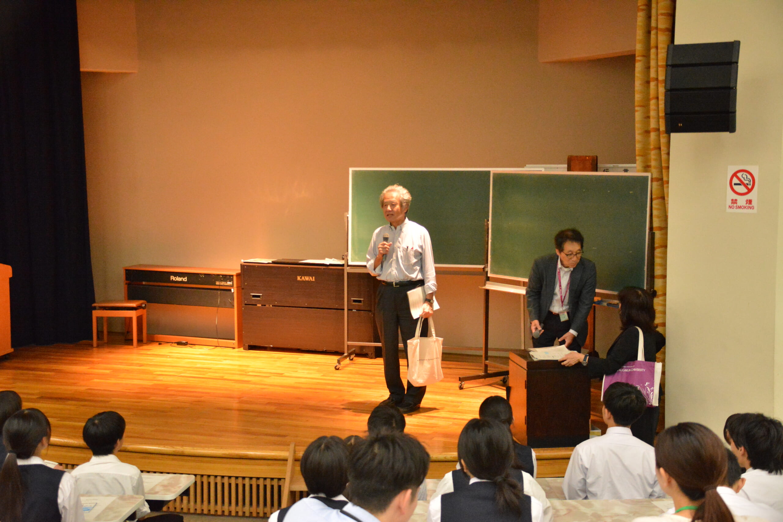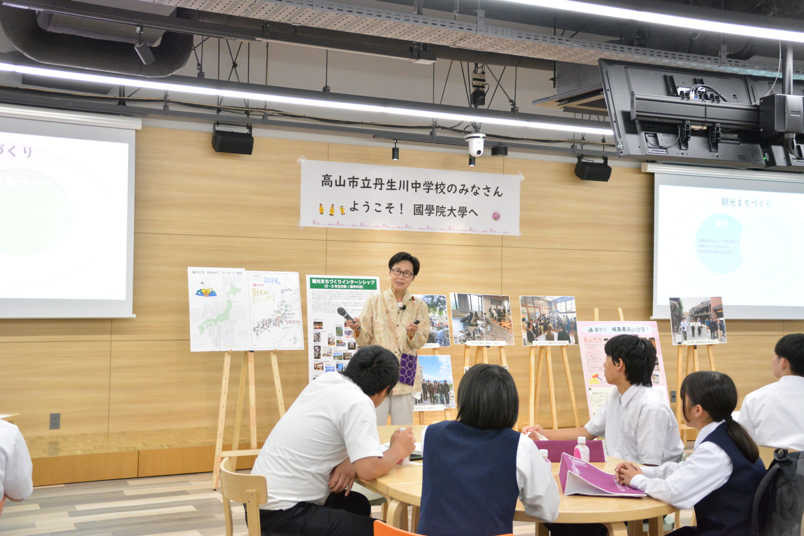 はじめに1号館講堂でガイダンスが行われました。西村幸夫・観光まちづくり学部長があいさつに立ち「國學院大學へようこそ。今日は短い時間ですが、キャンパス見学の時間なども設けていますのでぜひ楽しんでください」と生徒たちを歓迎し、丹生川中学校の竹林校長からは「本日は高山市の魅力を紹介するプレゼンや合唱など、生徒たちが色々なことを準備してきました」とお話しいただきました。
