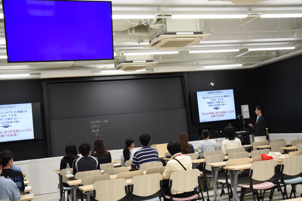 本日3日は総合学修館(6号館)で研修を実施し、約15人の内定者アドバイザーが参加しました。はじめにキャリアサポート課員と内定者アドバイザーが自己紹介を行った後、同課員が「内定者アドバイザーの皆さんには大学職員の一員として活動してほしい。自らの内定獲得の経験を伝え、後輩たちをサポートをしてほしい」と呼びかけて研修を開始。アドバイザーたちは身を引き締めて研修に臨んでいました。