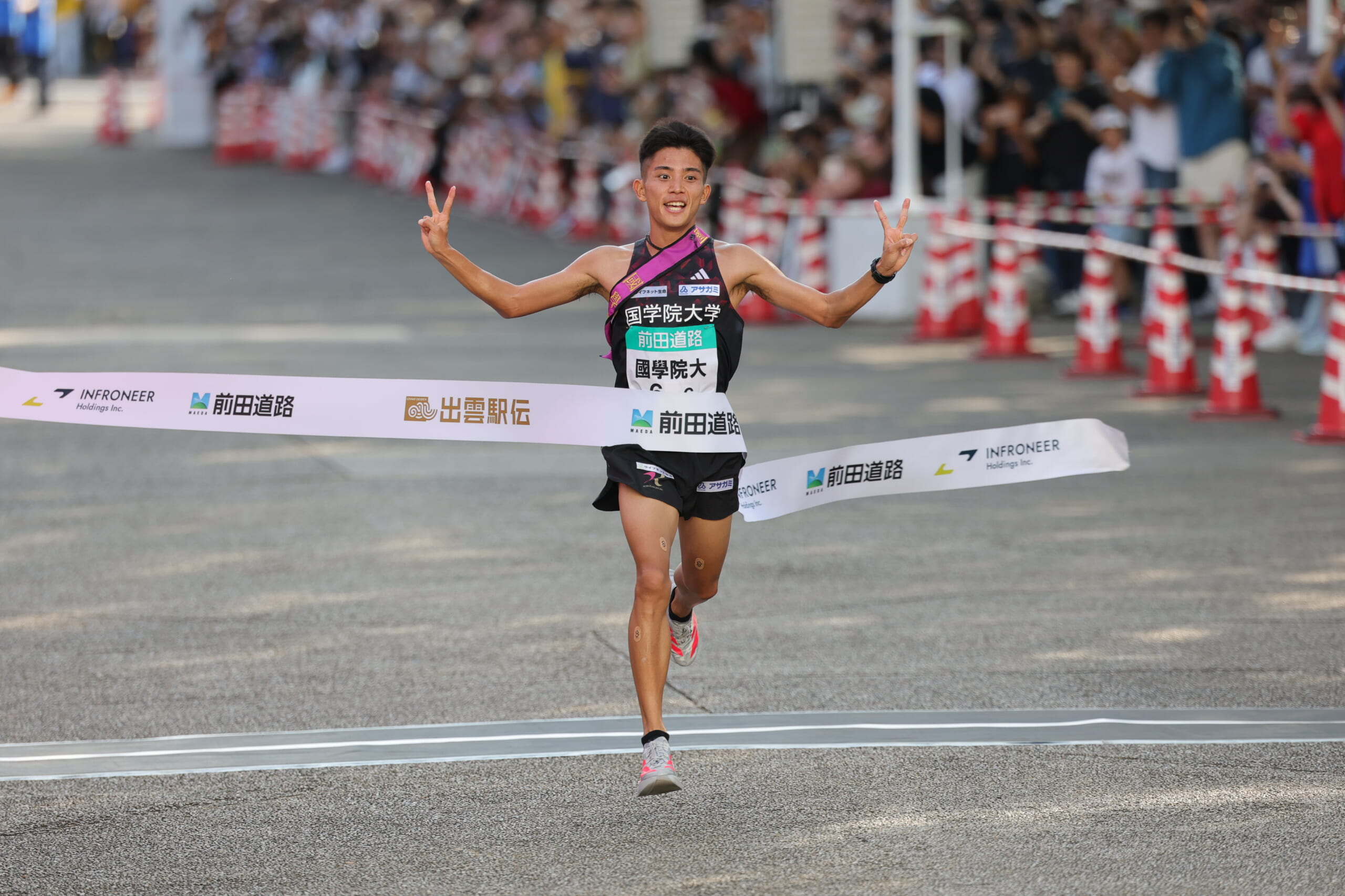 学生三大駅伝の一つで、駅伝シーズンの初戦となる出雲駅伝。1区の青木瑠郁選手(健体4)が5位で最初の襷リレーを行うと、2区の尾熊迅斗選手(健体2)が順位を維持。3区の野中恒亨選手(健体3)が区間2位の走りで2位に押し上げると、4区の辻原輝選手(史3)は区間新記録の快走で1位へ。5区の高山豪起選手(法4)も区間2位の走りを見せ、1位のまま襷リレーを行いました、最後はアンカーの上原琉翔主将(健体4)が落ち着いた走りで、1位でゴールテープを切りました。