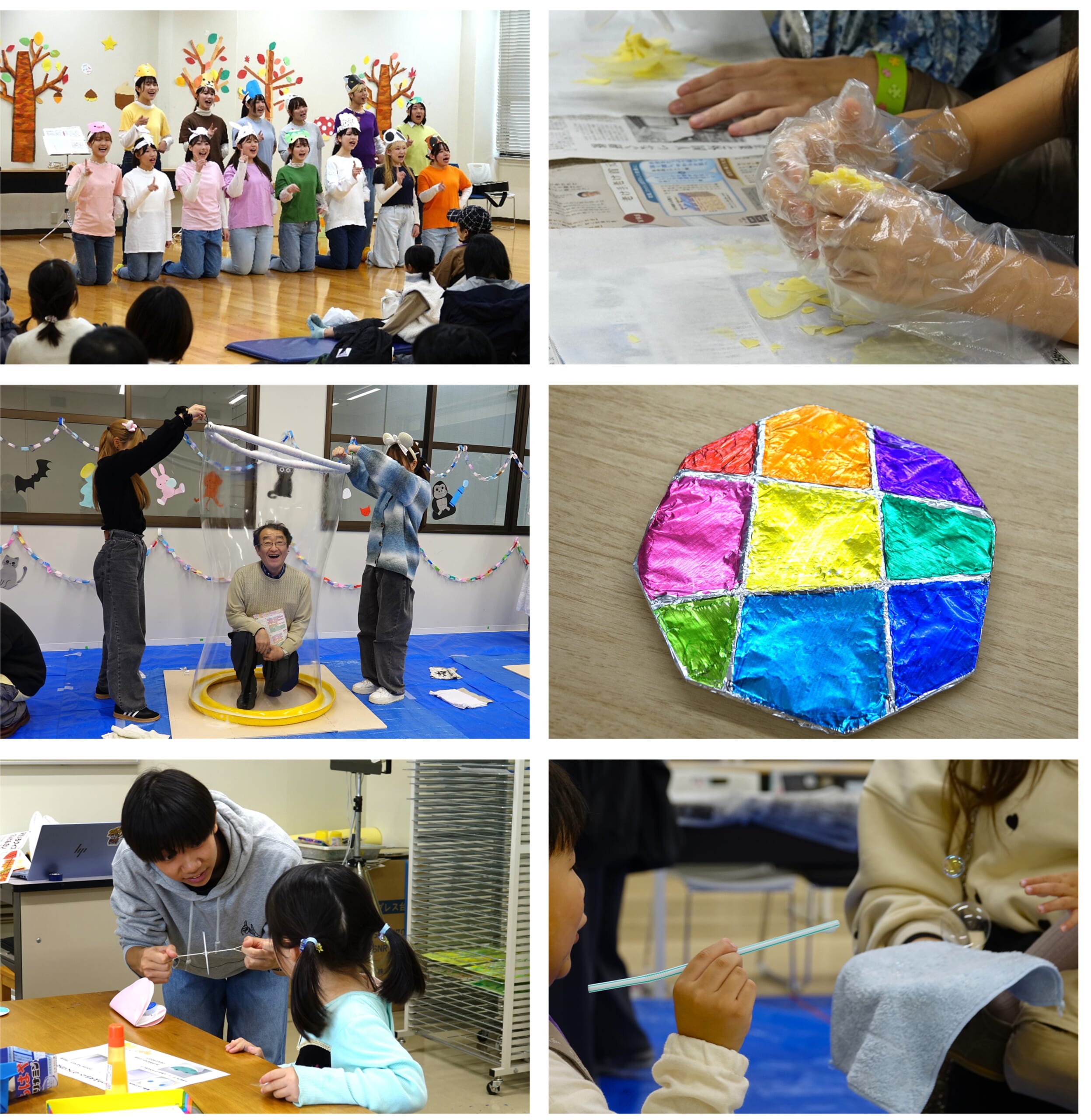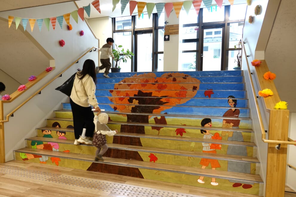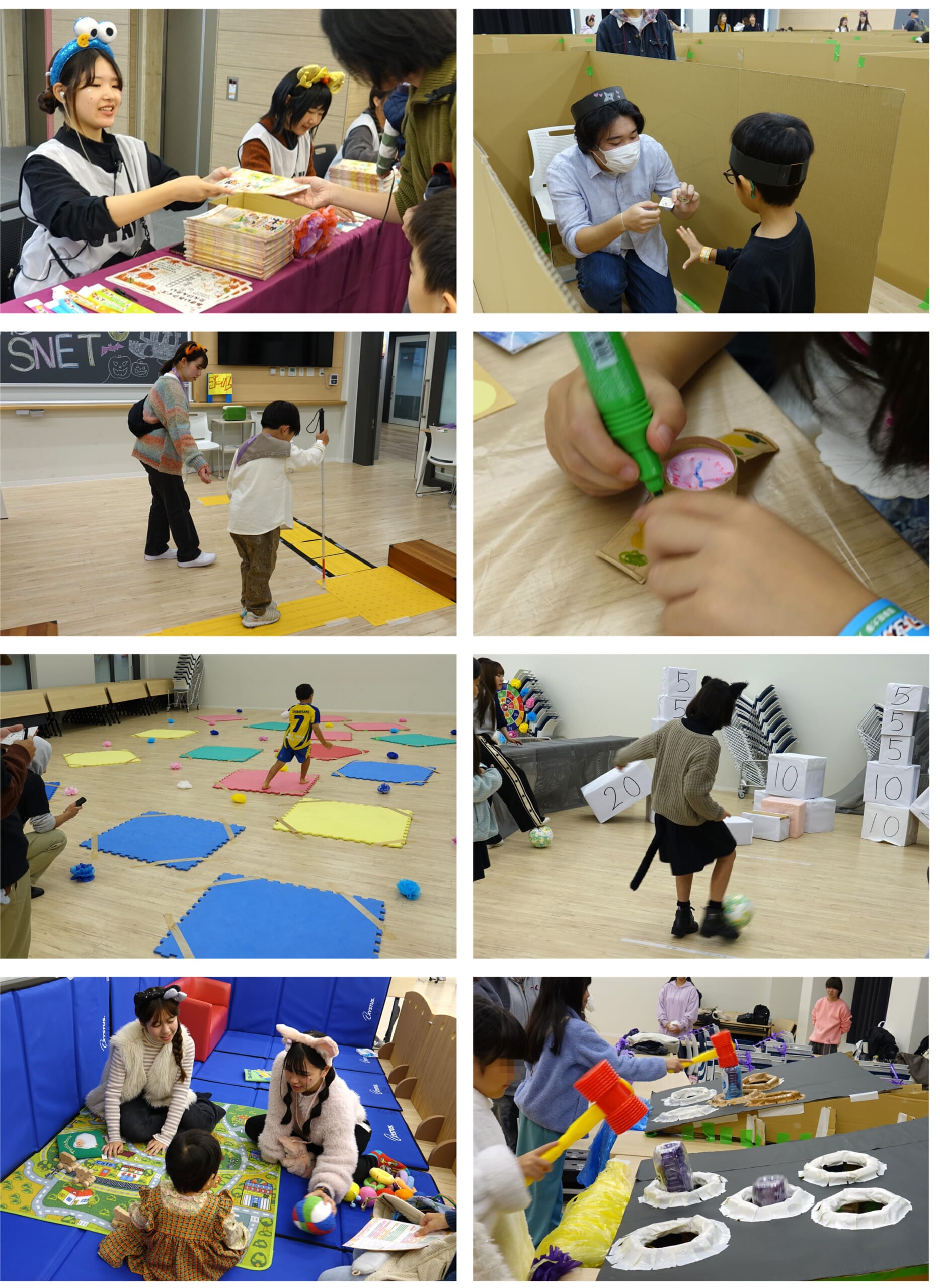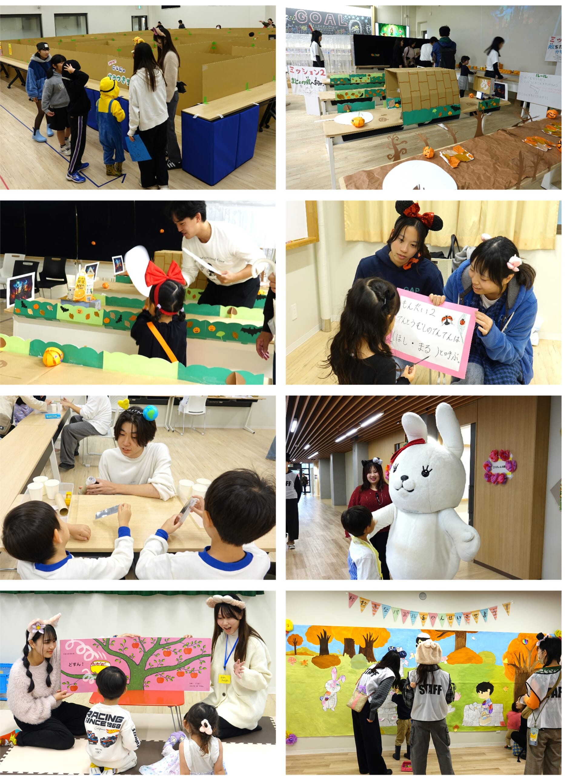 今年のテーマは「 つながる心、ひろがる笑顔」。3学科の学生が、これまでの学びを活かしてそれぞれ個性あふれる16のブースを提供しました。運営の主体である学生企画委員は、校内の装飾も担当。階段アートや撮影スポットも用意され、廊下の各所にクイズが隠されていて、探検しながら校内をめぐるスタンプラリーも用意されていました。あいにくの秋の冷たい長雨の1日でしたが、地域の子どもたちや保護者の方が続々と訪れ、キッチンカーも出店し、笑顔あふれるキャンパスとなりました。、
