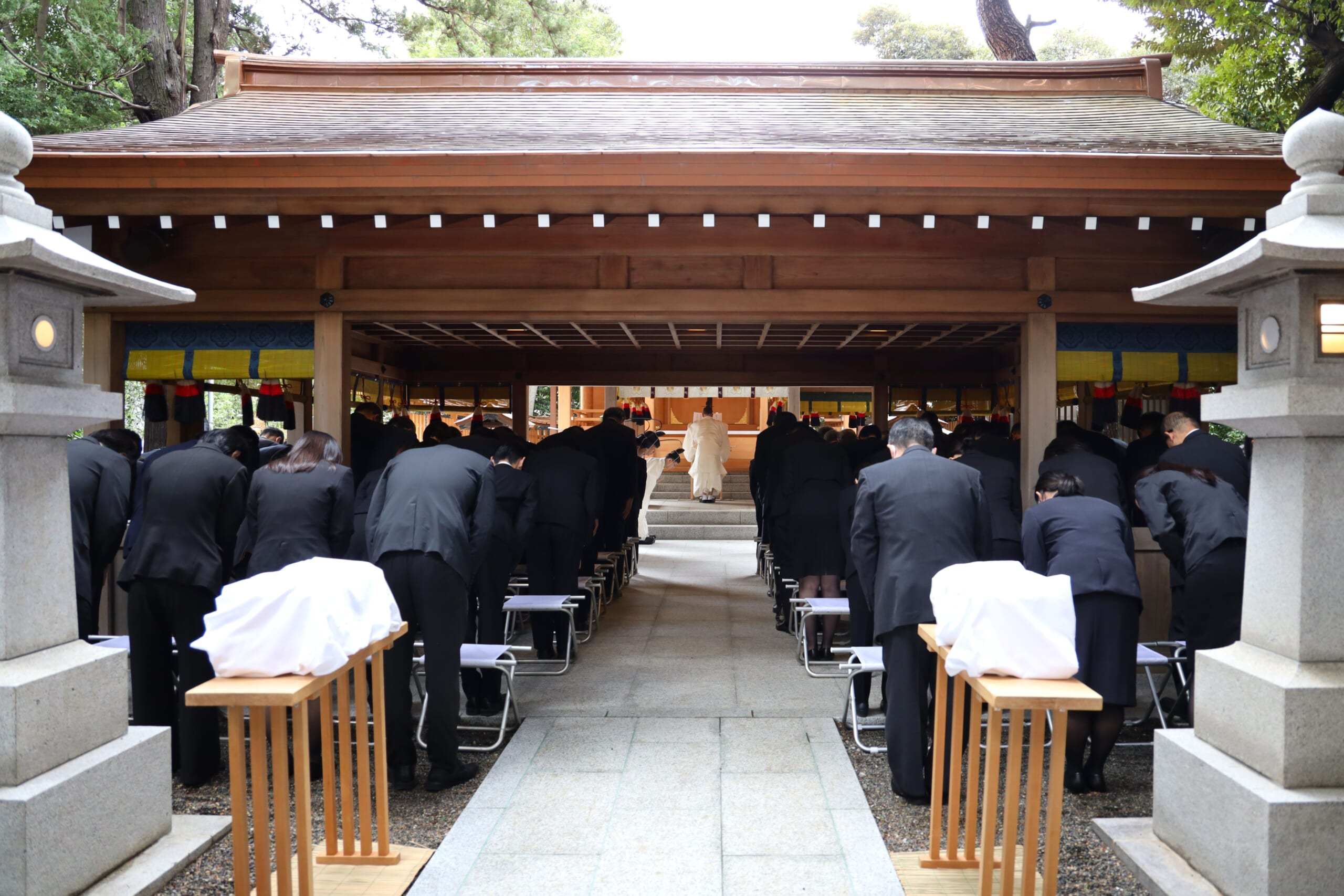 神饌を捧げ、斎主(大野靖仁神殿奉斎員・法人参事)の祝詞の奏上に続き、神道文化学部の学生が「浦安の舞」を奉仕し、今後の本法人と傘下校のさらなる発展を祈念しました。