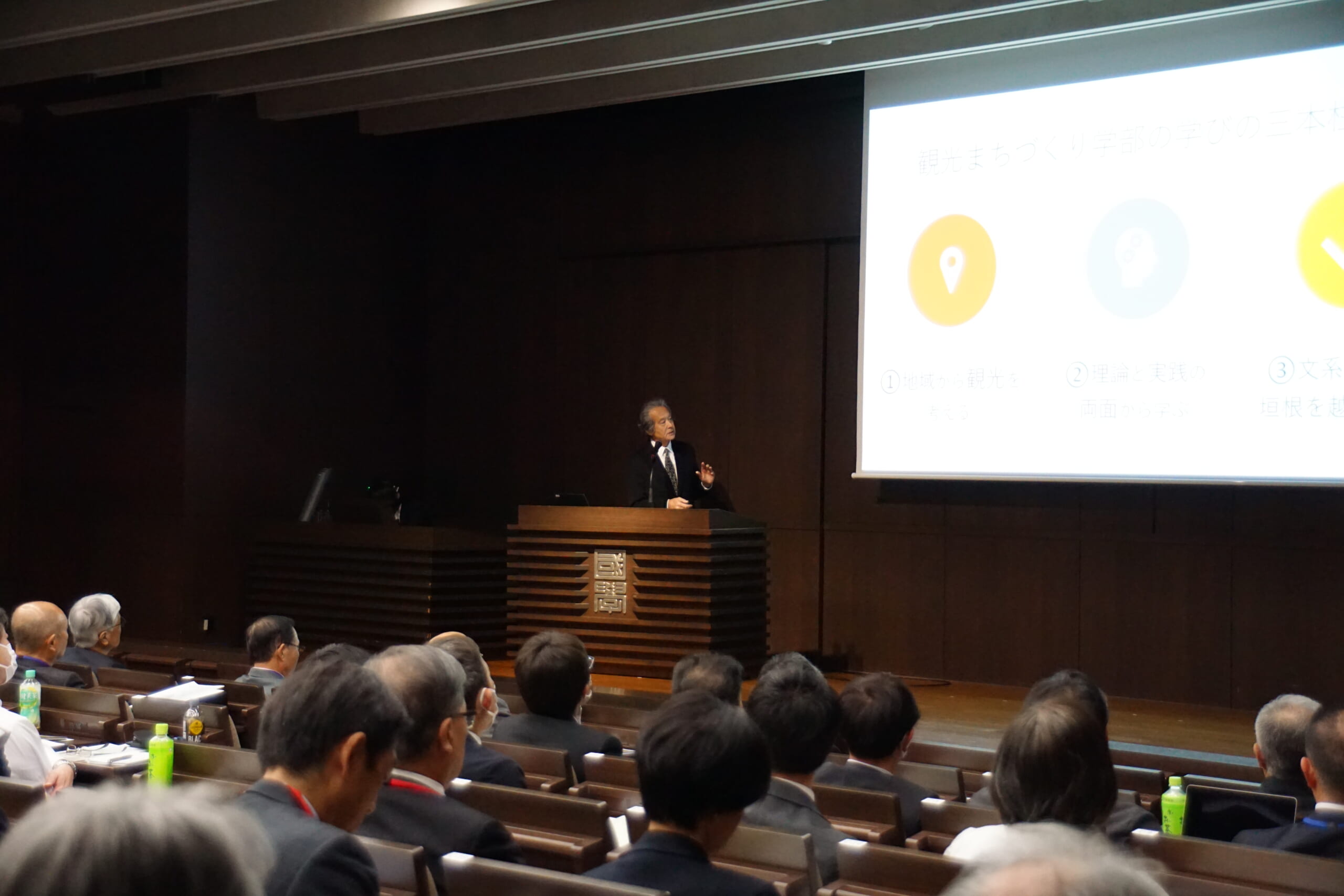 第1部では、はじめに針本正行学長のあいさつを、西村幸夫・観光まちづくり学部長(教授)が代読。「同学部では、全国各地域との包括連携協定締結によって教員や学生が地域を直接訪問することができており、まさに学部が掲げる『地域をみつめる』ことを実践している。皆様からの同学部への支援に深く感謝申し上げる」とあいさつしました。次に、来賓の桑野和泉・日本旅館協会会長が「地域社会がつながっていくうえで、観光まちづくりの学問が指針のような存在になることを願っている。今日ここに集った皆さまと共に励んでいきたい」とごあいさついただきました。続いて、西村学部長が同学部のこれまでの歩みや学部概要について説明しました。