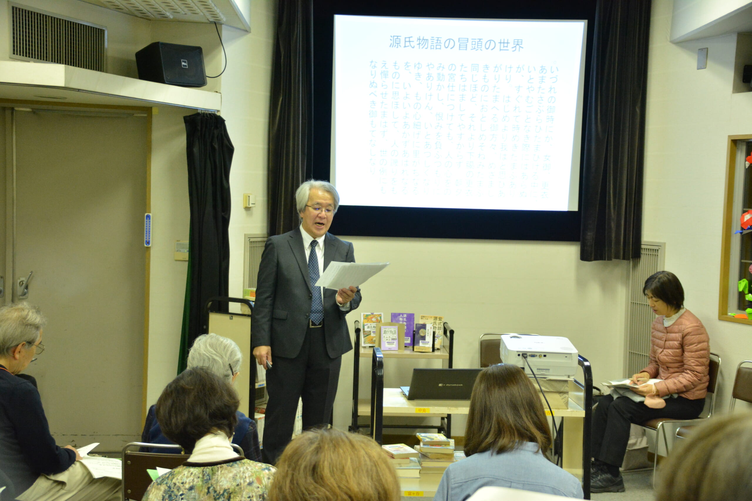 同事業の一環として行われる本読書会は年3回の開催を予定しており、竹内正彦・文学部教授が担当します。第2回目となる今回は「源氏物語の現代語訳を読む」と題して、午前10時より同館利用者含む20人を超える方々が参加しました。
