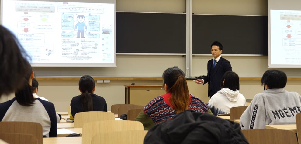 11/21(金)15:00-16:00、1101教室において学生部企画「傷病者への学内対応」が開催され、校医の橋詰剛先生が、授業時や緊急時に遭遇した、体調が悪化した人への適切な対応について講演されました。保健室への連絡方法や救急車を呼ぶべき症状、緊急対応が必要かどうか、判断に迷ったらどうするかなど、わかりやすく図解して話され、参加者は自分事として熱心に聞いていました。