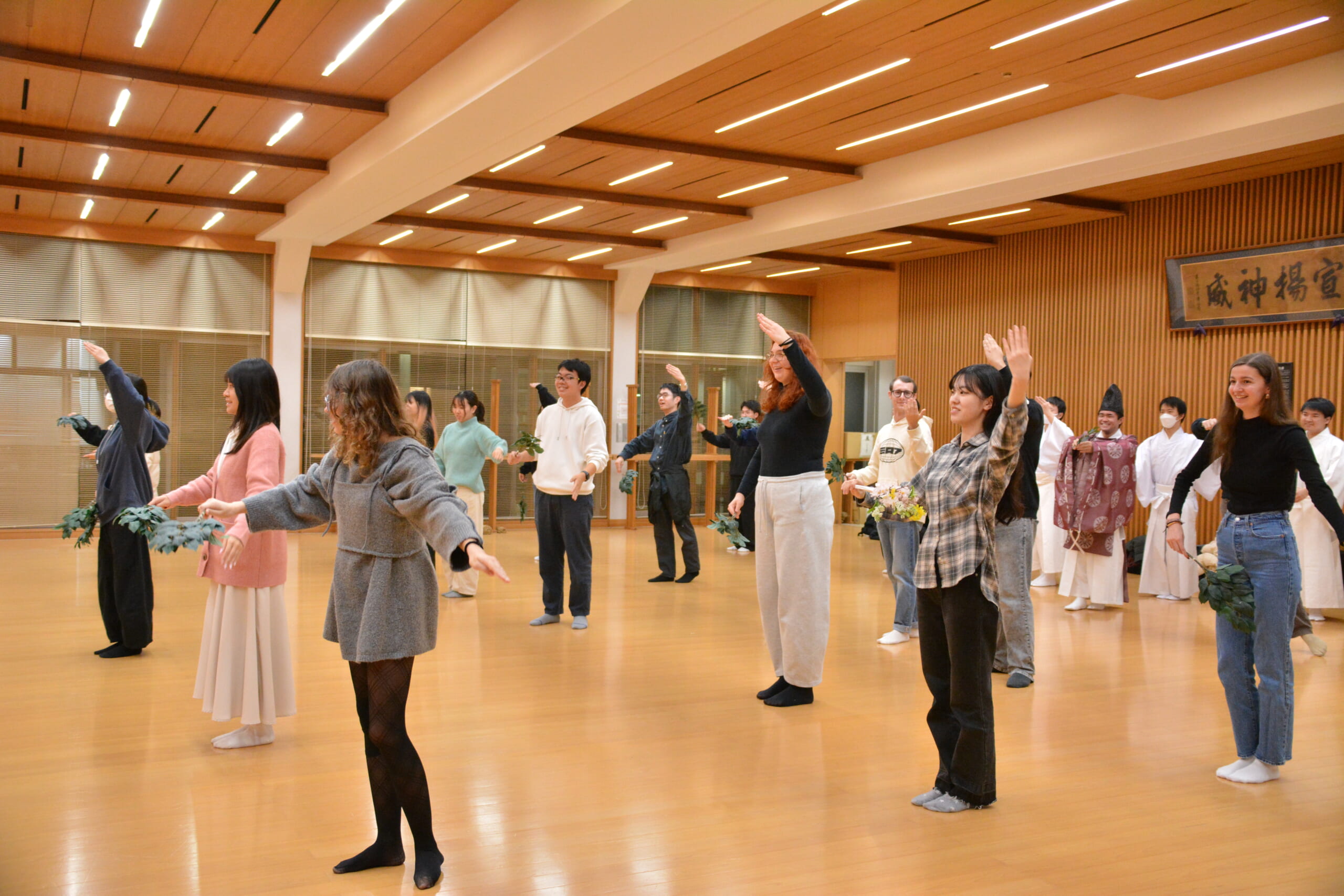 参加した学生は、禮法研究會の学生に作法を教えてもらいながら玉串拝礼の作法を実践したり、みすゞ会の学生と一緒に神にささげる舞の所作を練習しました。見よう見まねで所作に挑戦し、最後は互いに拍手を送り合いました。