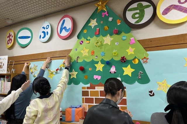 12/2(火)横浜市山内図書館において、子ども支援学科の島田ゼミの学生たちが絵本コーナーの壁面をクリスマス装飾で彩りました。12月の季節に合わせ、ツリーやリースなどをモチーフにした華やかなデザインが施され、訪れる親子連れに温かい雰囲気を届けています。