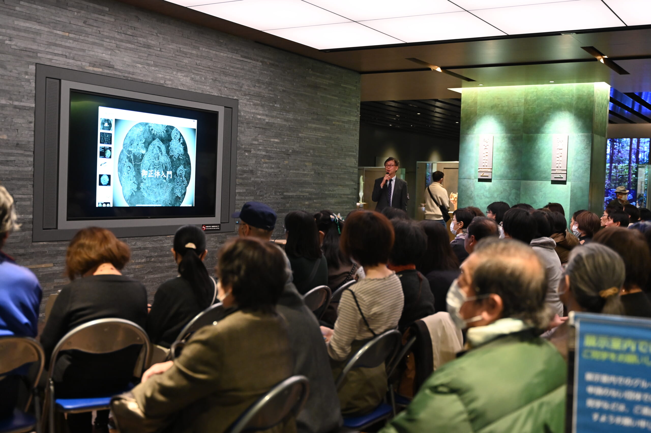 博物館では、本日まで開催されている企画展「中世日本の神々―物語・姿・秘説―」を一目見ようと多くの参加者が訪れました。企画展関連イベントとして開催された内川隆志・同館副館長(文学部教授)によるミュージアムトーク「御正体入門」では、座席は満員となり立ち見での参加者も多く出るほどの盛況ぶりを見せました。